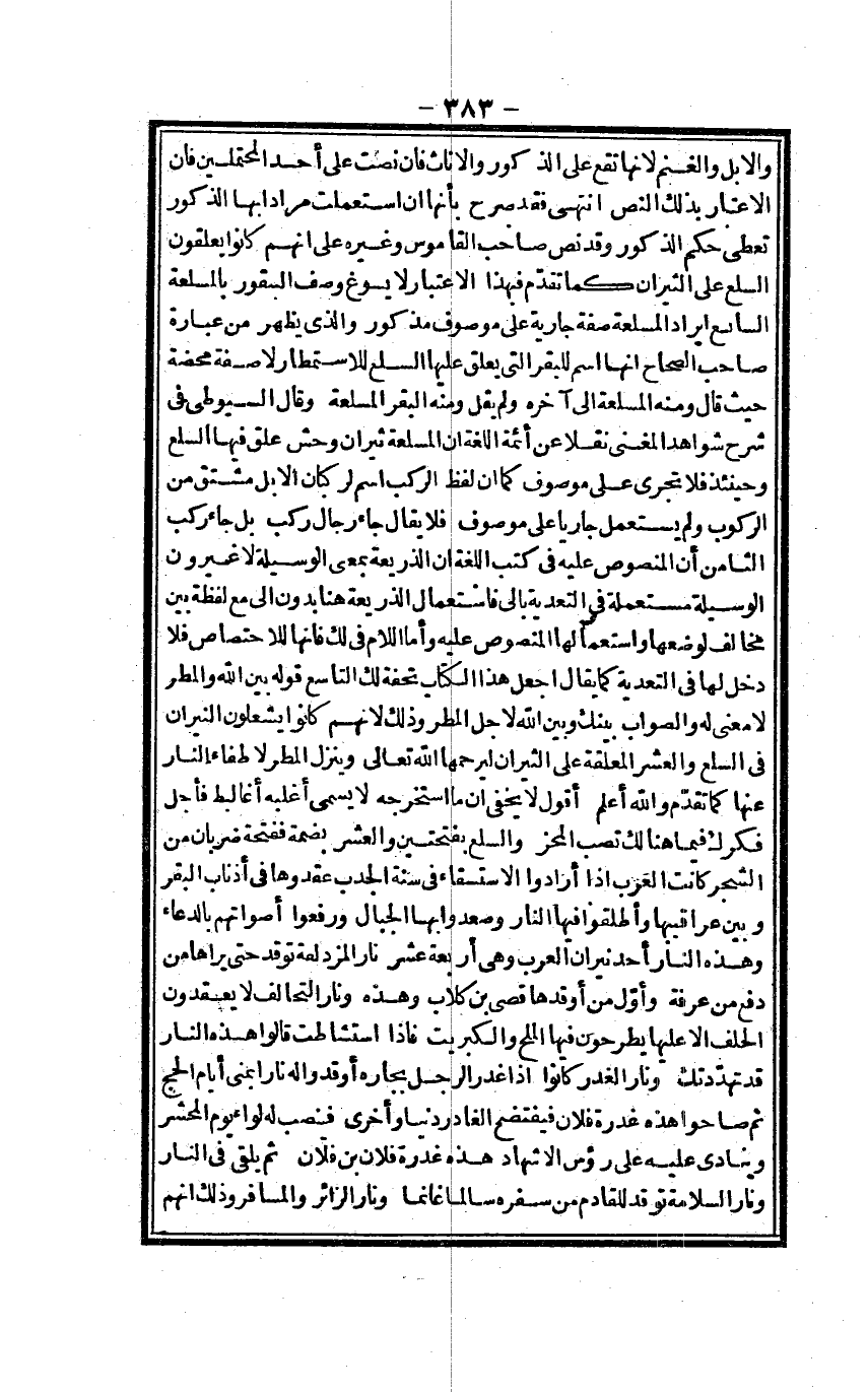 وَالْإِبِل وَالْغنم لِأَنَّهَا تقع على الذُّكُور وَالْإِنَاث فَإِن نصت على أحد المحتملين فَإِن الِاعْتِبَار بذلك النَّص انْتهى فقد صرح بِأَنَّهَا إِن اسْتعْملت مرَادا بهَا الذُّكُور تُعْطى حكم الذُّكُور وَقد نَص صَاحب الْقَامُوس وَغَيره على أَنهم كَانُوا يعلقون السّلع على الثيران كَمَا تقدم فَبِهَذَا الِاعْتِبَار لَا يسوغ وصف البقور بالمسلعة السَّابِع إِيرَاد المسلعة صفة جَارِيَة على مَوْصُوف مَذْكُور وَالَّذِي يظْهر من عبارَة صَاحب الصِّحَاح أَنَّهَا اسْم للبقر الَّتِي يعلق عَلَيْهَا السّلع للاستمطار لَا صفة مَحْضَة حَيْثُ قَالَ وَمِنْه المسلعة إِلَى آخِره وَلم يقل وَمِنْه الْبَقر المسلعة وَقَالَ السُّيُوطِيّ فِي شرح شَوَاهِد الْمُغنِي نقلا عَن أَئِمَّة اللُّغَة أَن المسلعة ثيران وَحش علق فِيهَا السّلع وَحِينَئِذٍ فَلَا تجْرِي على مَوْصُوف كَمَا أَن لفظ الركب اسْم لركبان الْإِبِل مُشْتَقّ من الرّكُوب وَلم يسْتَعْمل جَارِيا على مَوْصُوف فَلَا يُقَال جَاءَ رجال ركب بل جَاءَ ركب الثَّامِن أَن الْمَنْصُوص عَلَيْهِ فِي كتب اللُّغَة أَن الذريعة بِمَعْنى الْوَسِيلَة لَا غير وَأَن الْوَسِيلَة مستعملة فِي التَّعْدِيَة بإلى فاستعمال الذريعة هُنَا بِدُونِ إِلَى مَعَ لَفْظَة بَين مُخَالف لوضعها واستعمالها الْمَنْصُوص عَلَيْهِ وَأما اللَّام فِي لَك فَإِنَّهَا للاختصاص فَلَا دخل لَهَا فِي التَّعْدِيَة كَمَا يُقَال اجْعَل هَذَا الْكتاب تحفة لَك التَّاسِع قَوْله بَين الله والمطر لَا معنى لَهُ وَالصَّوَاب بَيْنك وَبَين الله لأجل الْمَطَر وَذَلِكَ لأَنهم كَانُوا يشعلون النيرَان فِي السّلع وَالْعشر الْمُعَلقَة على الثيران ليرحمها الله تَعَالَى وَينزل الْمَطَر لإطفاء النَّار عَنْهَا كَمَا تقدم وَالله أعلم أَقُول لَا يخفى أَن مَا استخرجه لَا يُسمى أغلبة أغاليط فأجل فكرك فِيمَا هُنَالك تصب المحز والسلع بِفتْحَتَيْنِ وَالْعشر بضمة ففتحة ضَرْبَان من الشّجر كَانَت الْعَرَب إِذا أَرَادوا الاسْتِسْقَاء فِي سنة الجدب عقدوها فِي أَذْنَاب الْبَقر وَبَين عراقيبها وأطلقوا فِيهَا النَّار وصعدوا بهَا الْجبَال وَرفعُوا أَصْوَاتهم بِالدُّعَاءِ وَهَذِه النَّار أحد نيران الْعَرَب وَهِي أَرْبَعَة عشر نَار الْمزْدَلِفَة توقد حَتَّى يَرَاهَا من دفع من عَرَفَة وأوّل من أوقدها قصي بن كلاب وَهَذِه ونار التَّحَالُف لَا يعقدون الْحلف إِلَّا عَلَيْهَا يطرحون فِيهَا الْملك والكبريت فَإِذا استشاطت قَالُوا هَذِه النَّار قد تهددتك ونار الْغدر كَانُوا إِذا غدر الرجل بجاره أوقدوا لَهُ نَارا بمنى أَيَّام الْحَج ثمَّ صاحوا هَذِه غدرة فلَان فيفتضح الغادر دنيا وَأُخْرَى فينصب لَهُ لِوَاء يَوْم الْمَحْشَر وينادى عَلَيْهِ على رُؤُوس الأشهاد هَذِه غدرة فلَان بن فلَان ثمَّ يلقى فِي النَّار ونار السَّلامَة توقد للقادم من سَفَره سالما غانماً ونار الزائر وَالْمُسَافر وَذَلِكَ أَنهم
