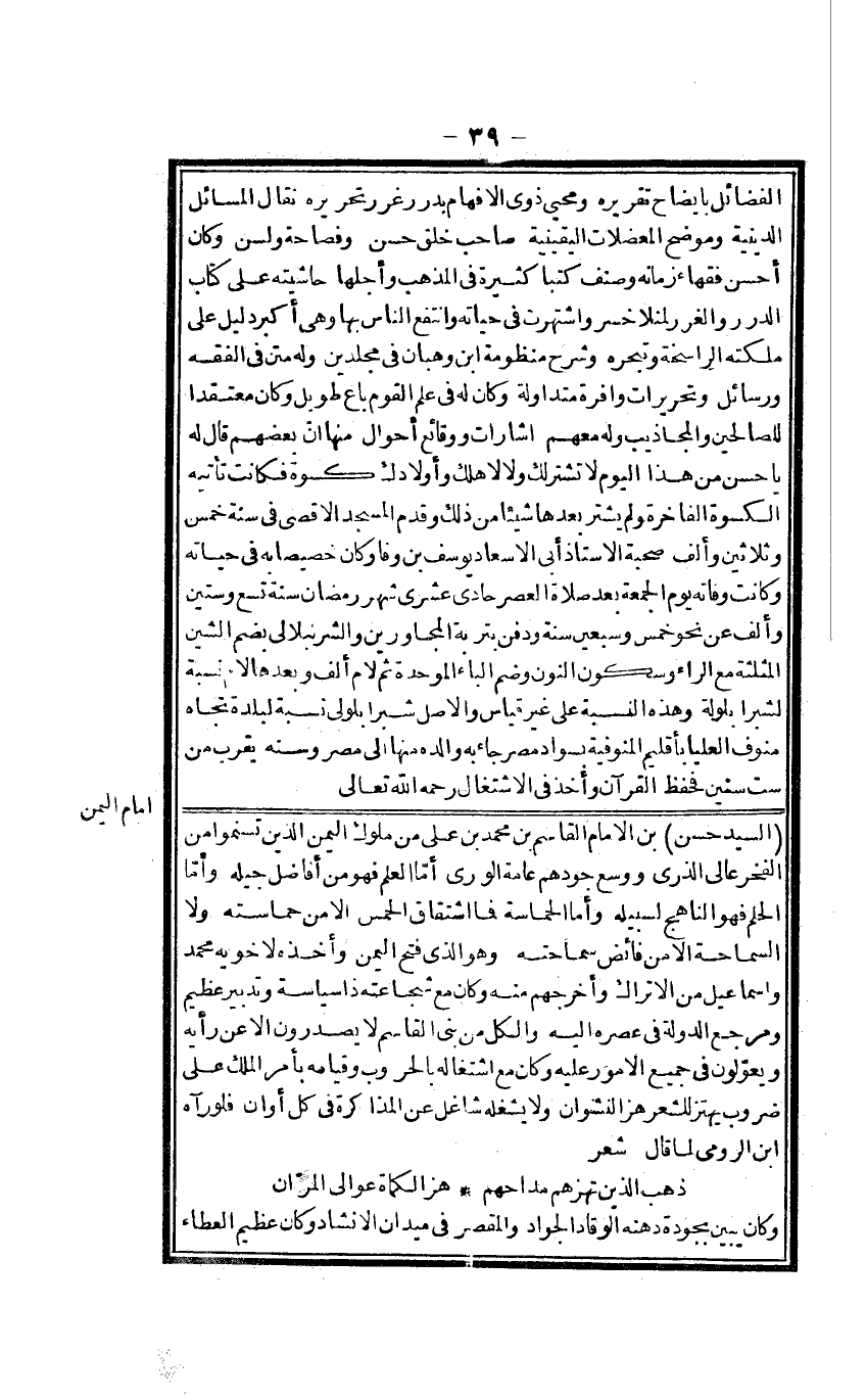 السَّيِّد حسن بن الإِمَام الْقَاسِم بن مُحَمَّد بن عَليّ من مُلُوك الْيمن الَّذين تسنموا من الْفَخر عالى الذرى ووسع جودهم عَامَّة الورى أما الْعلم فَهُوَ من أفاضل جيله وَأما الْحلم فَهُوَ الناهج لسبيله وَأما الحماسة فَمَا إشتقاق الحمس إِلَّا من حماسته وَلَا السماحة الأ من فائض سماحته وَهُوَ الَّذِي فتح الْيمن وَأَخذه لأخويه مُحَمَّد وَإِسْمَاعِيل من الأتراك وأخرجهم مِنْهُ وَكَانَ مَعَ شجاعته ذَا سياسة وتدبير عَظِيم ومرجع الدولة فِي عصره إِلَيْهِ وَالْكل من بنى الْقَاسِم لَا يصدرون إِلَّا عَن رَأْيه ويعولون فِي جَمِيع الْأُمُور عَلَيْهِ وَكَانَ مَعَ إشتغاله بالحروب وقيامه بِأَمْر الْملك على ضروب يَهْتَز الشّعْر هز النشوان وَلَا يشْغلهُ شاغل عَن المذاكرة فِي كل أَوَان فَلَو رَآهُ ابْن الرُّومِي لما قَالَ شعر