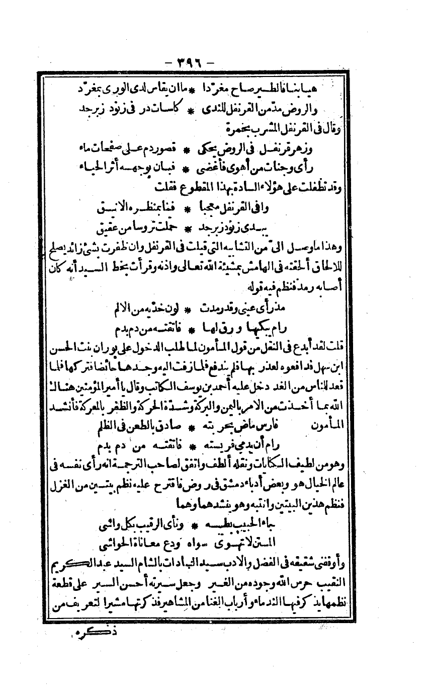 وأوقفني شقيقه فِي الْفضل وَالْأَدب سيد السادات بِالشَّام السَّيِّد عبد الْكَرِيم النَّقِيب حرس الله وجوده من الْغَيْر وَجعل سيرته أحسن السّير على قِطْعَة نظمها يذكر فِيهَا الندماء وأرباب الْغناء من الْمَشَاهِير فَذَكرتهَا مُشِيرا لتعريف من