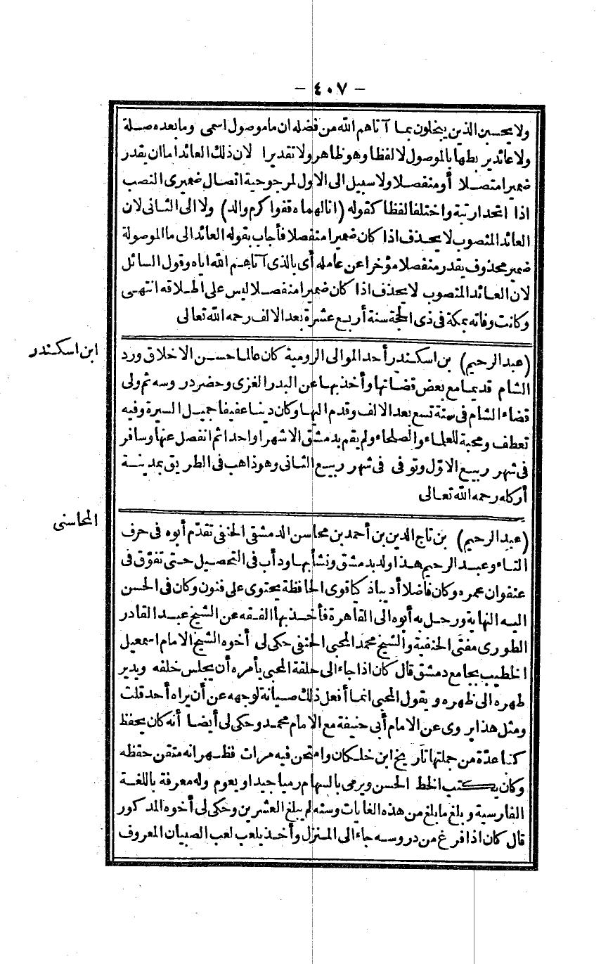 عبد الرَّحِيم بن تَاج الدّين بن أَحْمد بن محَاسِن الدِّمَشْقِي الْحَنَفِيّ تقدّم أَبوهُ فِي حرف التَّاء وَعبد الرَّحِيم هَذَا ولد بِدِمَشْق وَنَشَأ بهَا ودأب فِي التَّحْصِيل حَتَّى تفوّق فِي عنفوان عمره وَكَانَ فَاضلا أديباً ذكياً قوي الحافظة يحتوي على فنون وَكَانَ فِي الْحسن إِلَيْهِ النِّهَايَة ورحل بِهِ أَبوهُ إِلَى الْقَاهِرَة فَأخذ بهَا الْفِقْه عَن الشَّيْخ عبد الْقَادِر الطوري مفتي الْحَنَفِيَّة وَالشَّيْخ مُحَمَّد المحبي الْحَنَفِيّ حكى لي أَخُوهُ الشَّيْخ الإِمَام إِسْمَاعِيل الْخَطِيب بِجَامِع دمشق قَالَ كَانَ إِذا جَاءَ إِلَى حَلقَة المحبي يَأْمُرهُ أَن يجلس خَلفه ويدير ظَهره إِلَى ظَهره وَيَقُول المحبي إِنَّمَا أفعل ذَلِك صِيَانة لوجهه عَن أَن يرَاهُ أحد قلت وَمثل هَذَا يرْوى عَن الإِمَام أبي حنيفَة مَعَ الإِمَام مُحَمَّد وَحكى لي أَيْضا أَنه كَانَ يحفظ كتبا عدّة من جُمْلَتهَا تَارِيخ ابْن خلكان وامتحن فِيهِ مَرَّات فَظهر أَنه متقن حفظه وَكَانَ يكْتب الْخط الْحسن وَيَرْمِي بِالسِّهَامِ رمياً جيدا ويعوم وَله معرفَة باللغة الفارسية وَبلغ مَا بلغ من هَذِه الغايات وَسنة لم يبلغ الْعشْرين وَحكى لي أَخُوهُ الْمَذْكُور قَالَ كَانَ إِذا فرغ من دروسه جَاءَ إِلَى الْمنزل وَأخذ يلْعَب لعب الصّبيان الْمَعْرُوف