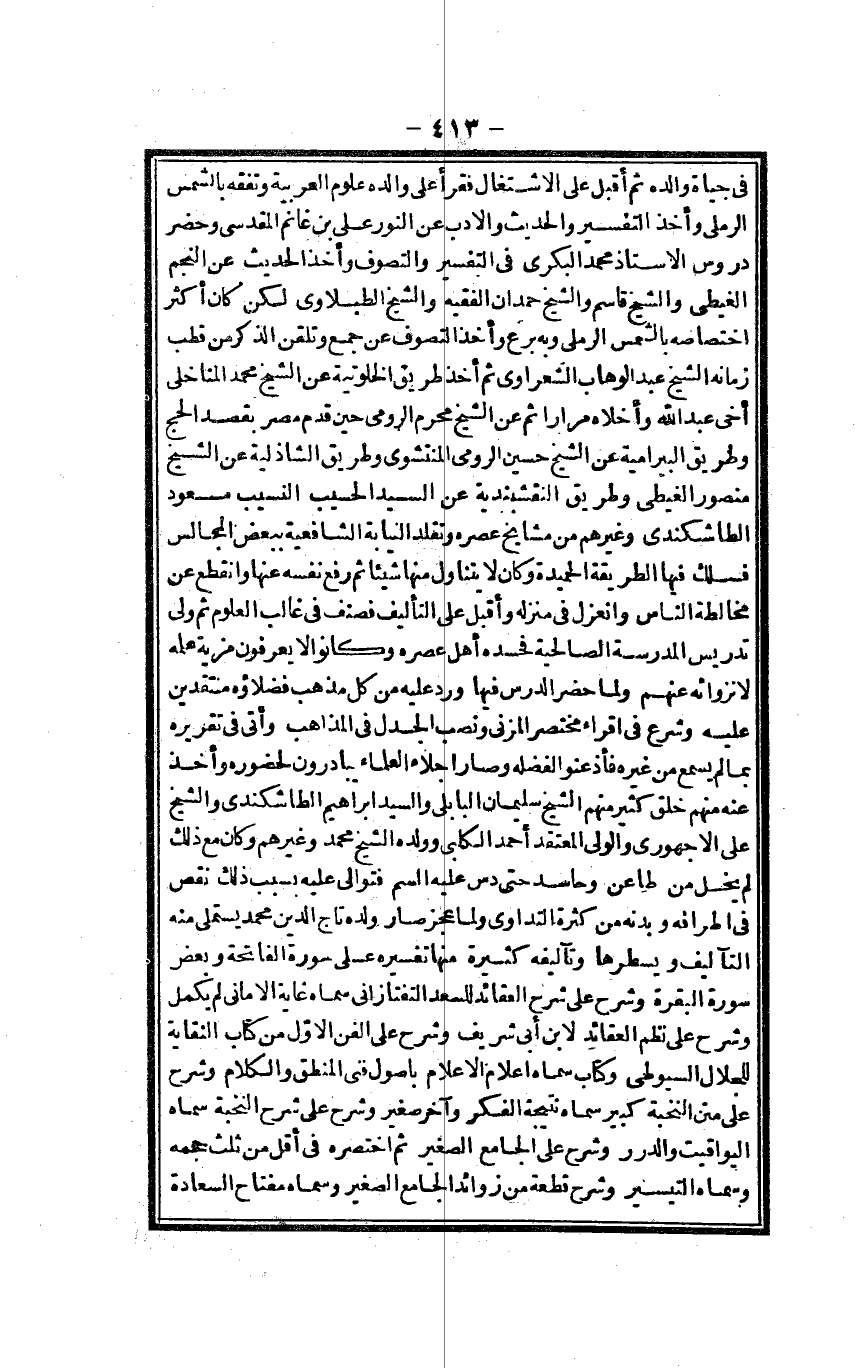 فِي حَيَاة وَالِده ثمَّ أقبل على الِاشْتِغَال فَقَرَأَ على وَالِده عُلُوم الْعَرَبيَّة وتفقه بالشمس الرَّمْلِيّ وَأخذ التَّفْسِير والْحَدِيث وَالْأَدب عَن النُّور عَليّ بن غَانِم الْمَقْدِسِي وَحضر دروس الاستاذ مُحَمَّد الْبكْرِيّ فِي التَّفْسِير والتصوف وَأخذ الحَدِيث عَن النَّجْم الغيطي وَالشَّيْخ قَاسم وَالشَّيْخ حمدَان الْفَقِيه وَالشَّيْخ الطبلاوي لَكِن كَانَ أَكثر اخْتِصَاصه بالشمس الرَّمْلِيّ وَبِه برع وَأخذ التصوف عَن جَمِيع وتلقن الذّكر من قطب زَمَانه الشَّيْخ عبد الْوَهَّاب الشعراوي ثمَّ أَخذ طَرِيق الخلوتية عَن الشَّيْخ مُحَمَّد المناخلي أخى عبد الله وأخلاه مرَارًا ثمَّ عَن الشَّيْخ محرم الرُّومِي حِين قدم مصر بِقصد الْحَج وَطَرِيق البيرامية عَن الشَّيْخ حُسَيْن الرُّومِي المنتشوى وَطَرِيق الشاذلية عَن الشَّيْخ مَنْصُور الغيطي وَطَرِيق النقشبندية عَن السَّيِّد الحسيب النسيب مَسْعُود الطاشكندي وَغَيرهم من مَشَايِخ عصره وتقلد النِّيَابَة الشَّافِعِيَّة بِبَعْض الْمجَالِس فسلك فِيهَا الطَّرِيقَة الحميدة وَكَانَ لَا يتَنَاوَل مِنْهَا شَيْئا ثمَّ رفع نَفسه عَنْهَا وَانْقطع عَن مُخَالطَة النَّاس وانعزل فِي منزله وَأَقْبل على التَّأْلِيف فصنف فِي غَالب الْعُلُوم ثمَّ ولي تدريس الْمدرسَة الصالحية فحسده أهل عصره وَكَانُوا لَا يعْرفُونَ مزية عمله لانزوائه عَنْهُم وَلما حضر الدَّرْس فِيهَا ورد عَلَيْهِ من كل مَذْهَب فضلاؤه منتقدين عَلَيْهِ وَشرع فِي إقراء مُخْتَصر الْمُزنِيّ وَنصب الجدل فِي الْمذَاهب وَأتي فِي تَقْرِيره بِمَا لم يسمع من غَيره فأذعنوا لفضله وَصَارَ إجلاء الْعلمَاء يبادرون لحضوره وَأخذ عَنهُ مِنْهُم خلق كثير مِنْهُم الشَّيْخ سُلَيْمَان البابلي وَالسَّيِّد إِبْرَاهِيم الطاشكندي وَالشَّيْخ عَليّ الأَجْهُورِيّ وَالْوَلِيّ المعتقد أَحْمد الْكَلْبِيّ وَولده الشَّيْخ مُحَمَّد وَغَيرهم وَكَانَ مَعَ ذَلِك لم يخل من طَاعن وحاسد حَتَّى دس عَلَيْهِ السم فتوالي عَلَيْهِ بِسَبَب ذَلِك نقص فِي أَطْرَافه وبدنه من كَثْرَة التَّدَاوِي وَلما عجز صَار وَلَده تَاج الدّين مُحَمَّد يستملي مِنْهُ التآليف ويسطرها وتآليفه كَثِيرَة مِنْهَا تَفْسِيره على سُورَة الْفَاتِحَة وَبَعض سُورَة الْبَقَرَة وَشرح على شرح العقائد للسعد التَّفْتَازَانِيّ سَمَّاهُ غَايَة الْأَمَانِي لم يكمل وَشرح على نظم العقائد لِابْنِ أبي شرِيف وَشرح على الْفَنّ الأول من كتاب النقاية للجلال السُّيُوطِيّ وَكتاب سَمَّاهُ أَعْلَام الْأَعْلَام بأصول فني الْمنطق وَالْكَلَام وَشرح على متن النخبة كَبِير سَمَّاهُ نتيجة الْفِكر وَآخر صَغِير وَشرح على شرح النخبة سَمَّاهُ اليواقيت والدرر وَشرح عَليّ الْجَامِع الصَّغِير ثمَّ اخْتَصَرَهُ فِي أقل من ثلث حجمه وَسَماهُ التَّيْسِير وَشرح قِطْعَة من زَوَائِد الْجَامِع الصَّغِير وَسَماهُ مِفْتَاح السَّعَادَة