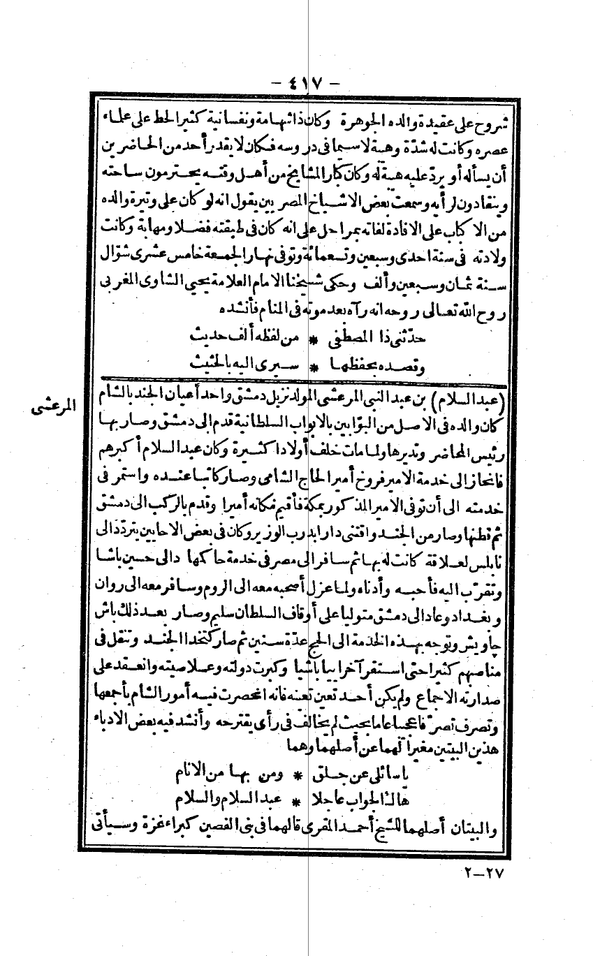 عبد السَّلَام بن عبد النَّبِي المرعشي المولد نزيل دمشق وَأحد أَعْيَان الْجند بِالشَّام كَانَ وَالِده فِي الأَصْل من البوابين بالأبواب السُّلْطَانِيَّة قدم إِلَى دمشق وَصَارَ بهَا رَئِيس المحاضر وتديرها وَلما مَاتَ خلف أَوْلَادًا كَثِيرَة وَكَانَ عبد السَّلَام أكبرهم فانحاز إِلَى خدمَة الْأَمِير فروخ أَمِير الْحَاج الشَّامي وَصَارَ كَاتبا عِنْده وَاسْتمرّ فِي خدمته إِلَى أَن توفّي الْأَمِير الْمَذْكُور بِمَكَّة فأقيم مكانة أَمِيرا وَقدم بالركب إِلَى دمشق ثمَّ قطنها وَصَارَ من الْجند واقتنى دَارا بدرب الْوَزير وَكَانَ فِي بعض الْأَحَايِين يتَرَدَّد إِلَى نابلس لعلاقة كَانَت لَهُ بهَا ثمَّ سَافر إِلَى مصر فِي خدمَة حاكمها دالي حُسَيْن باشا وتقرب إِلَيْهِ فَأَحبهُ وَأَدْنَاهُ وَلما عزل أَصْحَبهُ مَعَه إِلَى الرّوم وسافر مَعَه إِلَى روان وبغداد وَعَاد إِلَى دمشق مُتَوَلِّيًا على أوقاف السُّلْطَان سليم وَصَارَ بعد ذَلِك باش جاويش وَتوجه بِهَذِهِ الْخدمَة إِلَى الْحَج عدَّة سِنِين ثمَّ صَار كتخدا الْجند وتنقل فِي مناصبهم كثيرا حَتَّى اسْتَقر آخرا يياباشيا وَكَبرت دولته وَعلا صيته وانعقد على صدارته الْإِجْمَاع وَلم يكن أحد تعين تعينه فَإِنَّهُ انحصرت فِيهِ أُمُور الشَّام بأجمعها وَتصرف تَصرفا فاعجيبا عَاما بِحَيْثُ لم يُخَالف فِي رَأْي يقترحه وَأنْشد فِيهِ بعض الأدباء هذَيْن الْبَيْتَيْنِ مغيرا لَهما عَن أَصلهمَا وهما