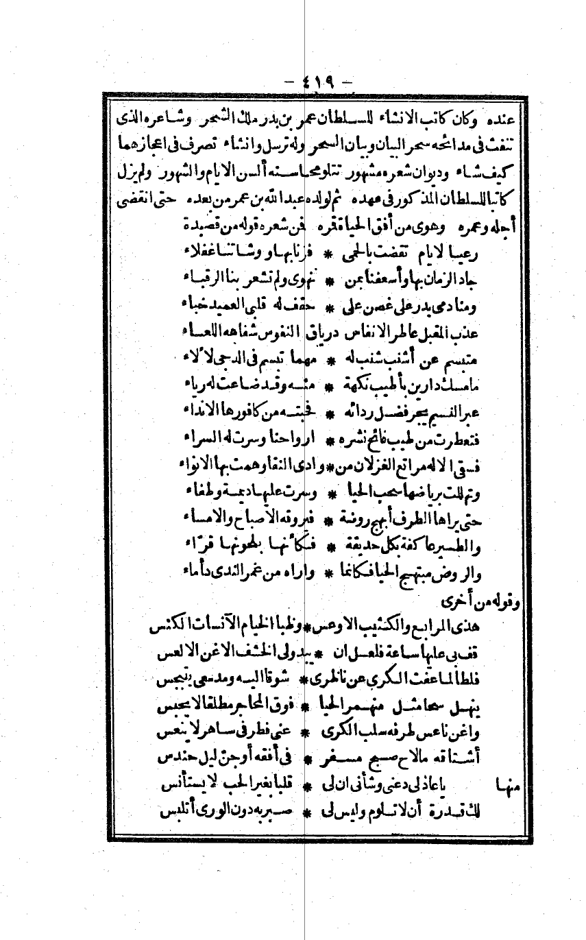 عِنْده وَكَانَ كَاتب الْإِنْشَاء للسُّلْطَان عمر بن بدر ملك الشحر وشاعره الَّذِي تنفث فِي مدائحه سحر الْبَيَان وَبَيَان السحر وَله ترسل وإنشاء تصرف فِي إعجازهما كَيفَ شَاءَ وديوان شعره مَشْهُور تتلو محاسنه ألسن الْأَيَّام والشهور وَلم يزل كَاتبا للسطان الْمَذْكُور فِي عَهده ثمَّ لوَلَده عبد الله بن عمر من بعده حَتَّى انْقَضى أَجله وعمره وَهوى من أفق الْحَيَاة قمره فَمن شعره قَوْله من قصيدة
