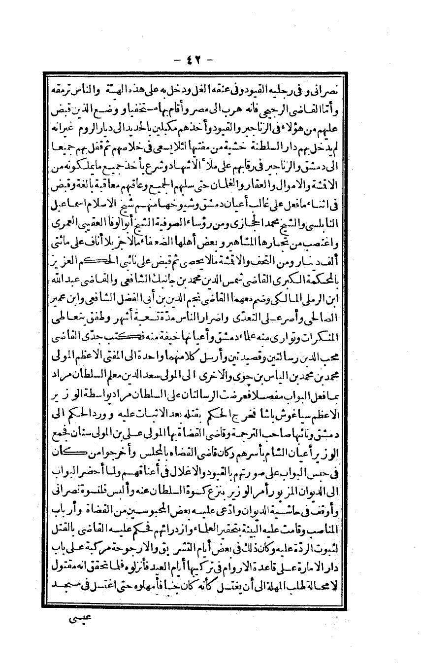 نَصْرَانِيّ وَفِي رجلَيْهِ الْقُيُود وَفِي عُنُقه الغل وَدخل بِهِ على هَذِه الْهَيْئَة وَالنَّاس ترمقه وَأما القَاضِي الرجيحي فَإِنَّهُ هرب إِلَى مصر وَأقَام بهَا مستخفياً وَوضع الَّذين قبض عَلَيْهِم من هَؤُلَاءِ فِي الزناجير والقيود وَأَخذهم مكبلين بالحديد إِلَى ديار الرّوم غير أَنه لم يدْخل بهم دَار السلطنة خشيَة من مفتيها لِئَلَّا يسْعَى فِي خلاصهم ثمَّ قفل بهم جَمِيعًا إِلَى دمشق والزناجير فِي رقابهم على مَلأ الأشهاد وَشرع يَأْخُذ جَمِيع مَا يملكونه من الأقمشة وَالْأَمْوَال وَالْعَقار والغلمان حَتَّى سلبهم الْجَمِيع وعاقبهم معاقبة بَالِغَة وَقبض فِي أثْنَاء مَا فعل على غَالب أَعْيَان دمشق وشيوخها مِنْهُم شيخ الْإِسْلَام إِسْمَاعِيل النابلسي وَالشَّيْخ مُحَمَّد الْحِجَازِي وَمن رُؤَسَاء الصُّوفِيَّة الشَّيْخ أَبُو الوفا العقيبي الْعمريّ واغتصب من تجارها الْمَشَاهِير وَبَعض أَهلهَا الضُّعَفَاء مَالا جزيلاً أناف على مِائَتي ألف دِينَار وَمن التحف والأقمشة مَا لَا يُحْصى ثمَّ قبض على نائبي الحكم الْعَزِيز بالمحكمة الْكُبْرَى القَاضِي شمس الدّين مُحَمَّد بن جَانِبك الشَّافِعِي وَالْقَاضِي عبد الله ابْن الرَّمْلِيّ الْمَالِكِي وَضم مَعَهُمَا القَاضِي نجم الدّين بن أبي الْفضل الشَّافِعِي وَابْن عُمَيْر الصَّالِحِي وأصر على التَّعَدِّي وأضرار النَّاس مُدَّة تِسْعَة أشهر وطفق يتعاطى الْمُنْكَرَات وتوارى مِنْهُ عُلَمَاء دمشق وأعيانها خيفة مِنْهُ فَكتب جدي القَاضِي محب الدّين رسالتين وقصيدتين وَأرْسل كلا مِنْهُمَا وَاحِدَة إِلَى الْمُفْتى الْأَعْظَم الْمولى مُحَمَّد بن مُحَمَّد بن الياس بن جوى وَالْأُخْرَى إِلَى الْمولى سعد الدّين معلم السُّلْطَان مُرَاد بِمَا فعل البواب مفصلا فعرضت الرسالتان على السُّلْطَان مُرَاد بِوَاسِطَة الْوَزير الْأَعْظَم سياغوش باشا فَخرج الحكم بقتْله بعد الاثبات عَلَيْهِ وَورد الحكم إِلَى دمشق ونائبها صَاحب التَّرْجَمَة وقاضي الْقُضَاة بهَا الْمولى على بن الْمولى سِنَان فَجمع الْوَزير أَعْيَان الشَّام بأسرهم وَكَانَ قَاضِي الْقُضَاة بِالْمَجْلِسِ وأخرجوا من كَانَ فِي حبس البواب على صورتهم بالقيود والأغلال فِي أَعْنَاقهم وَلما أحضر البواب إِلَى الدِّيوَان الْمَزْبُور أَمر الْوَزير بِنَزْع كسْوَة السُّلْطَان عَنهُ وألبس قلنسوة نَصْرَانِيّ وأوقف فِي حَاشِيَة الدِّيوَان وَادّعى عَلَيْهِ بعض المحبوسين من الْقُضَاة وأرباب المناصب وَقَامَت عَلَيْهِ الْبَيِّنَة بتحقير الْعلمَاء وازدرائهم فَحكم عَلَيْهِ القَاضِي بِالْقَتْلِ لثُبُوت الرِّدَّة عَلَيْهِ وَكَانَ ذَلِك فِي بعض أَيَّام التَّشْرِيق والأرجوحة مركبة على بَاب دَار الْإِمَارَة على قَاعِدَة الأروام فِي تركيبها أَيَّام الْعِيد فأنزلوه فَلَمَّا تحقق أَنه مقتول لَا محَالة طلب المهلة إِلَى أَن يغْتَسل كَأَنَّهُ كَانَ جنبا فأمهلوه حَتَّى اغْتسل فِي مَسْجِد