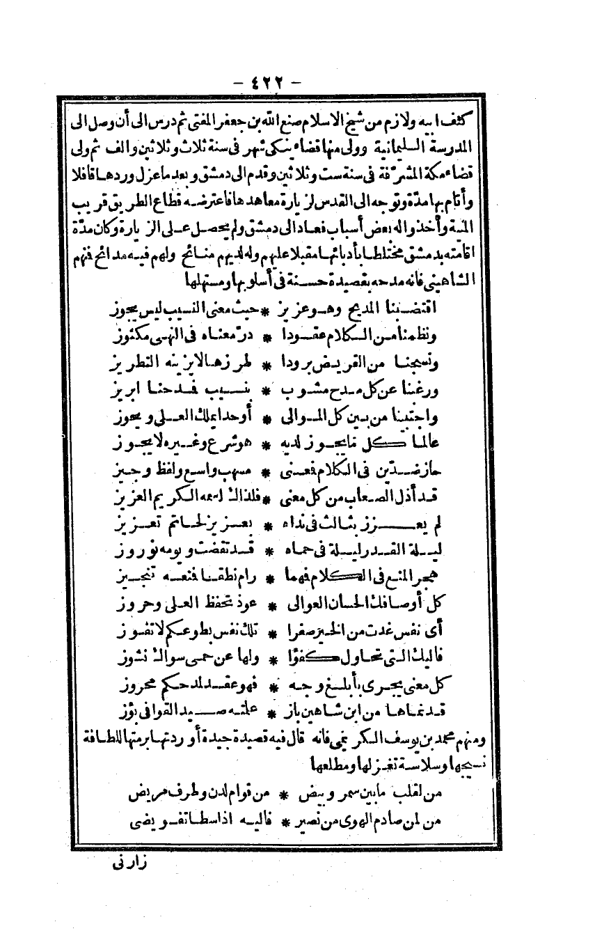 كنف أَبِيه ولازم من شيخ الْإِسْلَام صنع الله بن جَعْفَر الْمُفْتِي ثمَّ درس إِلَى أَن وصل إِلَى الْمدرسَة السليمانية وَولي مِنْهَا قَضَاء ينكى شهر فِي سنة ثَلَاث وَثَلَاثِينَ وَألف ثمَّ ولي قَضَاء مَكَّة المشرفة فِي سنة سِتّ وَثَلَاثِينَ وَقدم إِلَى دمشق وَبَعْدَمَا عزل وردهَا قَافِلًا وَأقَام بهَا مُدَّة وَتوجه إِلَى الْقُدس لزيارة معاهدها فاعترضه قطاع الطَّرِيق قريب الْمنية وَأخذُوا لَهُ بعض أَسبَاب فَعَاد إِلَى دمشق وَلم يحصل على الزِّيَارَة وَكَانَت مُدَّة إِقَامَته بِدِمَشْق مختلطا بأدبائها مُقبلا عَلَيْهِم وَله لديهم منائج وَلَهُم فِيهِ مدائح فَمنهمْ الشاهيني فَإِنَّهُ مدحه بقصيدة حَسَنَة فِي أسلوبها ومستهلها