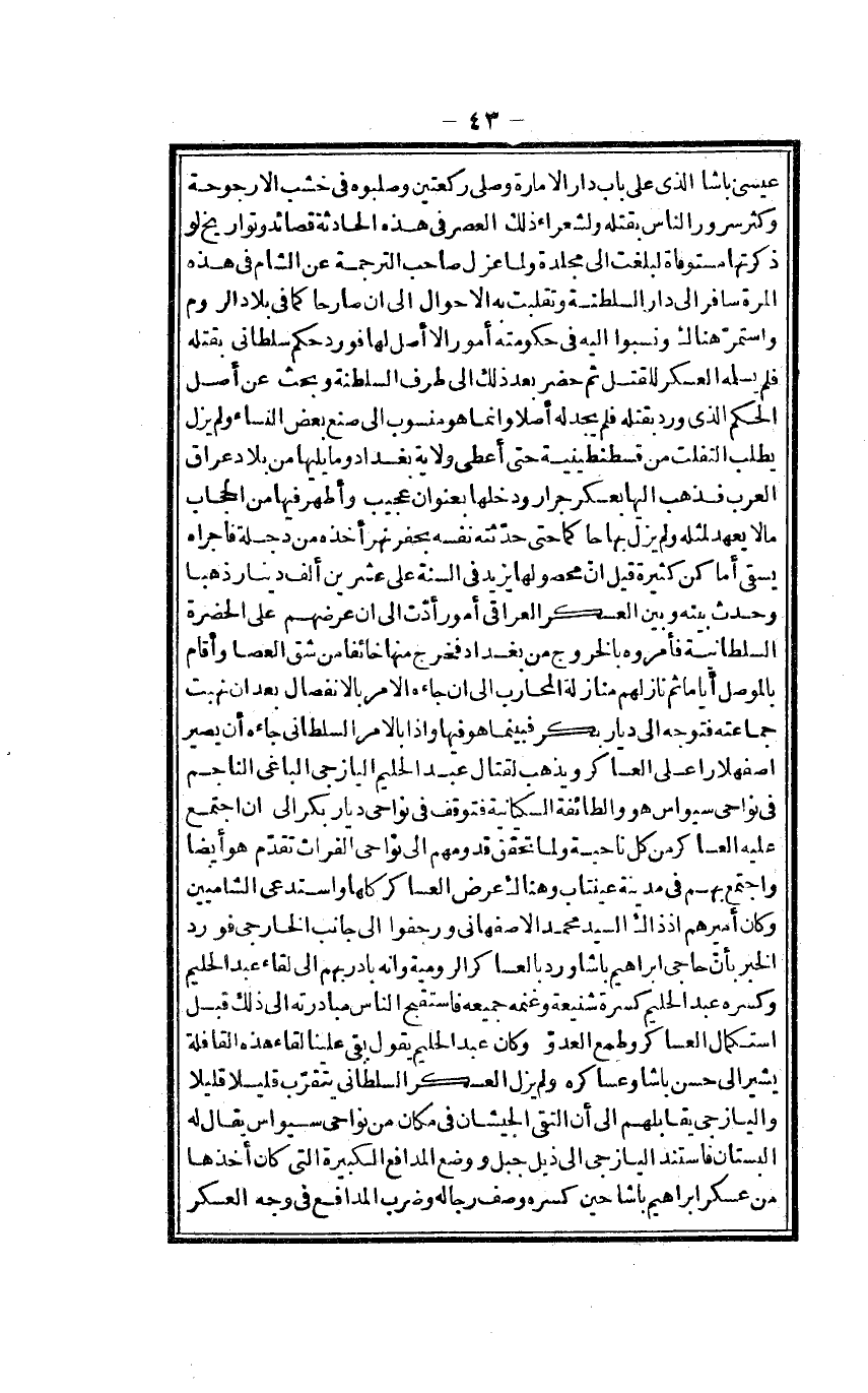 عِيسَى باشا الَّذِي على بَاب دَار الْإِمَارَة وَصلى رَكْعَتَيْنِ وصلبوه فِي خشب الأرجوحة وَكثر سرُور النَّاس بقتْله ولشعراء ذَلِك الْعَصْر فِي هَذِه الْحَادِثَة قصائد وتواريخ لَو ذكرتها مستوفاة لبلغت إِلَى مجلدة وَلما عزل صَاحب التَّرْجَمَة عَن الشَّام فِي هَذِه الْمرة سَافر إِلَى دَار السلطنة وتقلبت بِهِ الْأَحْوَال إِلَى أَن صَار حَاكما فِي بِلَاد الرّوم وَاسْتمرّ هُنَاكَ ونسبوا إِلَيْهِ فِي حكومته أمورا لَا أصل لَهَا فورد حكم سلطاني بقتْله فَلم يُسلمهُ الْعَسْكَر للْقَتْل ثمَّ حضر بعد ذَلِك إِلَى طرف السلطنة وَبحث عَن أصل الحكم الَّذِي ورد بقتْله فَلم يجد لَهُ أصلا وَإِنَّمَا هُوَ مَنْسُوب إِلَى صنع بعض النِّسَاء وَلم يزل يطْلب التفلت من قسطنطينية حَتَّى أعطي ولَايَة بَغْدَاد وَمَا يَليهَا من بِلَاد عراق الْعَرَب فَذهب إِلَيْهَا بعسكر جرار ودخلها بعنوان عَجِيب وأطهر فِيهَا من الْحجاب مَالا يعْهَد لمثله وَلم يزل بهَا حَاكما حَتَّى حدثته نَفسه بِحَفر نهر أَخذه من دجلة فأجراه يسْقِي أَمَاكِن كَثِيرَة قيل أَن محصولها يزِيد فِي السّنة على عشْرين ألف دِينَار ذَهَبا وَحدث بَينه وَبَين الْعَسْكَر الْعِرَاقِيّ أُمُور أدَّت إِلَى أَن عرضهمْ على الحضرة السُّلْطَانِيَّة فأمروه بِالْخرُوجِ من بَغْدَاد فَخرج مِنْهُ خَائفًا من شقّ الْعَصَا وَأقَام بالموصل أَيَّامًا ثمَّ نازلهم منازلة الْمُحَارب إِلَى أَن جَاءَهُ الْأَمر بالانفصال بعد أَن نهبت جماعته فَتوجه إِلَى ديار بكر فَبَيْنَمَا هُوَ فِيهَا وَإِذا بِالْأَمر السلطاني جَاءَهُ أَن يصير أصفهلارا على العساكر وَيذْهب لقِتَال عبد الْحَلِيم اليازجي الْبَاغِي الناجم فِي نواحي سيواس هُوَ والطائفة السكيانية فتوقف فِي نواحي ديار بكر إِلَى أَن اجْتمع عَلَيْهِ العساكر من كل نَاحيَة وَلما تحقق قدومهم إِلَى نواحي الْفُرَات تقدم هُوَ أَيْضا وَاجْتمعَ بهم فِي مَدِينَة عينتاب وَهُنَاكَ عرض العساكر كلهَا واستدعى الشاميين وَكَانَ أَمِيرهمْ إِذْ ذَاك السَّيِّد مُحَمَّد الْأَصْفَهَانِي ورجفوا إِلَى جَانب الْخَارِجِي فورد الْخَبَر بِأَن حاجي إِبْرَاهِيم باشا ورد بالعساكر الرومية وَأَنه بَادر بهم إِلَى لِقَاء عبد الْحَلِيم وكسره عبد الْحَلِيم كسرة شنيعة وغنمه جَمِيعه فاستقبح النَّاس مبادرته إِلَى ذَلِك قبل استكمال العساكر وطمع الْعَدو وَكَانَ عبد الْحَلِيم يَقُول بَقِي علينا لِقَاء هَذِه الْقَافِلَة يُشِير إِلَى حسن باشا وعساكره وَلم يزل الْعَسْكَر السلطاني يتَقرَّب قَلِيلا قَلِيلا واليازجي يقابلهم إِلَى أَن التقى الجيشان فِي مَكَان من نواحي سيواس يُقَال لَهُ الْبُسْتَان فاستند اليازجي إِلَى ذيل جبل وَوضع المدافع الْكَبِيرَة الَّتِي كَانَ أَخذهَا من عَسْكَر إِبْرَاهِيم باشا حِين كَسره وصف رِجَاله وَضرب المدافع فِي وَجه الْعَسْكَر