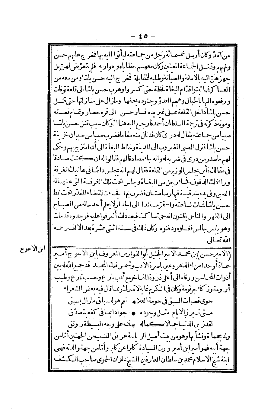 الْأَمِير حسن بن مُحَمَّد الْأَمِير الْجَلِيل أَبُو الفوارس الْمَعْرُوف بِابْن الأعوج أَمِير حماة أوحد أُمَرَاء الدَّهْر وَعين باصرة الْأَدَب وشمس فلك الْمجد قد جمع الله لَهُ بَين أدوات المحاسن ورقاه إِلَى أَعلَى ذرْوَة والمفاخر مَعَ أدب بارع وَحسب تارع وَطيب أرومة وزكاء جرثومة وَكَانَ فِي الْكَرم غَايَة لَا تدْرك وَمِمَّا قَالَ فِيهِ بعض الشُّعَرَاء