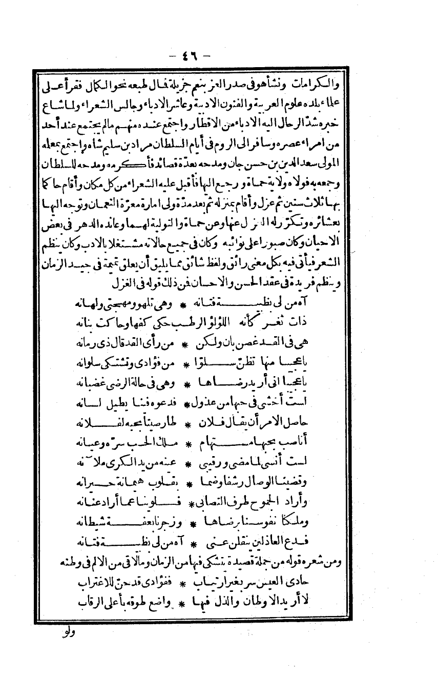 والكرامات وَنَشَأ هُوَ فِي صدر الْعِزّ بنعم جزيلة فَمَال طبعه نَحْو الْكَمَال فَقَرَأَ على عُلَمَاء بَلَده عُلُوم الْعَرَبيَّة والفنون الأدبية وعاشر الأدباء وجالس الشُّعَرَاء وَلما شاع خَبره شدّ الرّحال إِلَيْهِ الأدباء من الأقطار وَاجْتمعَ عِنْده مِنْهُم مَا لم يجْتَمع عِنْد أحد من أُمَرَاء عصره وسافر إِلَى الرّوم فِي أَيَّام السُّلْطَان مُرَاد بن سليم شاه وَاجْتمعَ بمعلمه الْمولى سعد الدّين بن حسن جَان ومدحه بعدة قصائد فَأكْرمه ومدحه للسُّلْطَان وَجمعه بِهِ فولاه ولَايَة حماة وَرجع إِلَيْهَا فَأقبل عَلَيْهِ الشُّعَرَاء من كل مَكَان وَأقَام حَاكما بهَا ثَلَاث سِنِين ثمَّ عزل وَأقَام بمنزله ثمَّ بعد مُدَّة ولى إِمَارَة معرة النُّعْمَان وَتوجه إِلَيْهَا بعشائره وتكرر لَهُ الْعَزْل عَنْهَا وَعَن حماة وَالتَّوْلِيَة لَهما وعانده الدَّهْر فِي بعض الأحيان وَكَانَ صبورا على نوائبه وَكَانَ فِي جَمِيع حالاته مشتغلا بالأدب وَكَانَ ينظم الشّعْر فَيَأْتِي فِيهِ بِكُل معنى رائق وَلَفظ شائق مِمَّا يَلِيق أَن يعلق تَمِيمَة فِي جيد الزَّمَان وينظم فريدة فِي عقد الْحسن وَالْإِحْسَان فَمن ذَلِك قَوْله فِي الْعَزْل