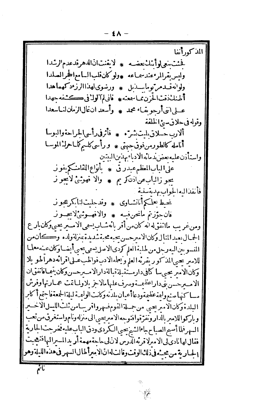 وَمن غَرِيب مَا اتّفق لَهُ أَنه كَانَ من أقربائه شَاب يُسمى الْأَمِير يحيى وَكَانَ بارع الْجمال بعيد المنال وَكَانَ الْأَمِير حسن يُحِبهُ محبَّة شَدِيدَة بِمَنْزِلَة وَلَده وَكَانَ من المنسوبين إِلَيْهِ رجل من طلبة الْعلم كردِي الأَصْل يُسمى يحيى أَيْضا وَكَانَ عينه معلما للأمير يحيى الْمَذْكُور يقرئه الْعلم ويعلمه الْأَدَب فواظب على إقرائه دهرا طَويلا وَكَانَ الْأَمِير يحيى سَاكِنا فِي دَار مُسْتَقْبلَة قبالة دَار الْأَمِير حسن وَكَانَ يَتِيما فاتفق أَن الْأَمِير حسن بنى دَارا عَظِيمَة وَصرف عَلَيْهَا مَالا جزيلا وَلما تمت عمارتها وفرش مساكنها صنع وَلِيمَة عَظِيمَة ودعا أَعْيَان بلدته وَكَانَت الْوَلِيمَة لَيْلَة الْجُمُعَة فَاجْتمع أكَابِر الْبَلدة وَكَانَ الْأَمِير يحيى من جملَة الْقَوْم فسهروا قَرِيبا من ثلث اللَّيْل الْأَخير وباركوا للأمير بِالدَّار وَتَفَرَّقُوا فَتوجه الْأَمِير يحيى إِلَى منزله ونام واستغرق من تَعب السهر فَلَمَّا أصبح الصَّباح جَاءَ الشَّيْخ يحيى الْكرْدِي ودق الْبَاب عَلَيْهِ فَخرجت الْجَارِيَة فَقَالَ لَهَا نَادِي لي الْأَمِير لاقرئه الدَّرْس لِأَن لي حَاجَة مهمة أُرِيد الْمسير إِلَيْهَا فتعجبت الْجَارِيَة من مَجِيئه فِي ذَلِك الْوَقْت وَقَالَت لَهُ أَن الْأَمِير أَطَالَ السهر فِي هَذِه اللَّيْلَة وَهُوَ
