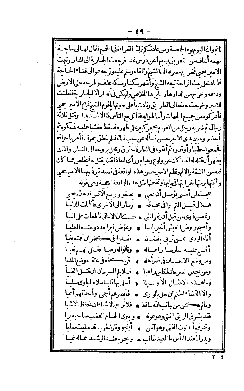 نَائِم وَأَن الْيَوْم يَوْم الْجُمُعَة وَمن عادتكم ترك الْقِرَاءَة فِي الْجمع فَقَالَ لَهَا لي حَاجَة مهمة أَخَاف من التعويق بِسَبَبِهَا عَن درس غَد فَرَجَعت الْجَارِيَة إِلَى الدَّار ونبهت الْأَمِير يحيى فَخرج مسرعا إِلَى الشَّيْخ وتلقاه وَسلم عَلَيْهِ وَتوجه هُوَ إِلَى قَضَاء الْحَاجة فَلَمَّا دخل بَيت الرَّاحَة تبعه الشَّيْخ وَأشهر سكينا ومسكه بعنف وَطَرحه على الأَرْض وذبحه وَخرج من الدَّار هَارِبا يُرِيد الْخَلَاص وَلم يكن فِي الدَّار إِلَّا الْجَارِيَة ففطنت للأمير وَخرجت خَلفه إِلَى الطَّرِيق وَنَادَتْ بِأَعْلَى صَوتهَا يَا قوم الشَّيْخ ذبح الْأَمِير يحيى فأدركوه من جَمِيع الْجِهَات وَأَحَاطُوا بِهِ فقاتل مَعَ النَّاس قتالا شَدِيدا وَقتل ثَلَاثَة رجال ثمَّ ضربه رجل من الْعَوام بِحجر كَبِير على ظَهره فَسقط مغشيا عَلَيْهِ فمسكوه ثمَّ أحضروه بَين يَدي الْأَمِير حسن فَسَأَلَهُ عَن سَبَب ذَلِك فَلم ينْطق بِحرف فَأمر بإحراقه فَجمعُوا حطبا وأوقدوه ثمَّ ألقوه فِي النَّار فَاحْتَرَقَ وَعجل بِرُوحِهِ إِلَى النَّار وَالَّذِي يظْهر أَن قَتله لَهُ إِنَّمَا كَانَ عَن ولوع وهيام وَرَأى أَنه إِذا قَتله يقتل بِهِ فيخلص مِمَّا كَانَ فِيهِ من الْمَشَقَّة والألم ونظم الْأَمِير حسن هَذِه الْوَاقِعَة فِي قصيدة يرثي بهَا الْأَمِير يحيى وأثبتها برمتها لغرابتها فِي بَابهَا وتضمنها مثل هَذِه الْوَاقِعَة العجيبة وَهِي قَوْله