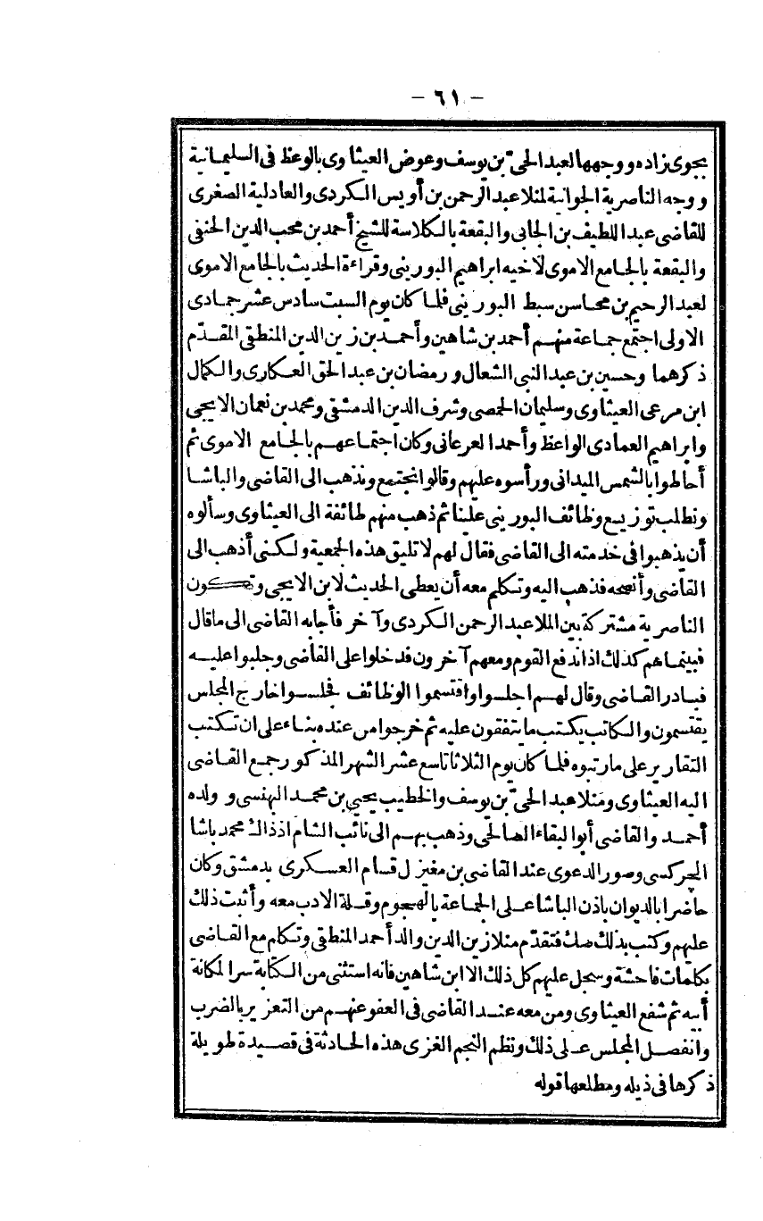 بجوى زَاده ووجهها لعبد الْحَيّ بن يُوسُف وَعوض العيثاوي بالوعظ فِي السليمانية وَوجه الناصرية الجوانية لمنلا عبد الرَّحْمَن بن أويس الْكرْدِي والعادلية الصُّغْرَى للْقَاضِي عبد اللَّطِيف بن الجابي والبقعة بالكلاسة للشَّيْخ أَحْمد بن محب الدّين الْحَنَفِيّ والبقعة بالجامع الْأمَوِي لِأَخِيهِ إِبْرَاهِيم البوريني وَقِرَاءَة الحَدِيث بالجامع الْأمَوِي لعبد الرَّحِيم بن محَاسِن سبط البوريني فَلَمَّا كَانَ يَوْم السبت سادس عشر جُمَادَى الأولى اجْتمع جمَاعَة مِنْهُم أَحْمد بن شاهين وَأحمد بن زين الدّين المنطقي الْمُقدم ذكرهمَا وحسين بن عبد النَّبِي الشعال ورمضان بن عبد الْحق العكاري والكمال ابْن مرعي العيثاوي وَسليمَان الْحِمصِي وَشرف الدّين الدِّمَشْقِي وَمُحَمّد بن نعْمَان الأيجي وَإِبْرَاهِيم الْعِمَادِيّ الْوَاعِظ وَأحمد العرعاني وَكَانَ اجْتِمَاعهم بالجامع الْأمَوِي ثمَّ أحاطوا بالشمس الميداني ورأسوه عَلَيْهِم وَقَالُوا نَجْتَمِع وَنَذْهَب إِلَى القَاضِي والباشا ونطلب توزيع وظائف البوريني علينا ثمَّ ذهب مِنْهُم طَائِفَة إِلَى العيثاوي وسألوه أَن يذهبوا فِي خدمته إِلَى القَاضِي فَقَالَ لَهُم لَا تلِيق هَذِه الجمعية وَلَكِنِّي أذهب إِلَى القَاضِي وأنصحه فَذهب إِلَيْهِ وَتكلم مَعَه أَن يعْطى الحَدِيث لِابْنِ الأيجي وَتَكون الناصرية مُشْتَركَة بَين الملا عبد الرَّحْمَن الْكرْدِي وَآخر فَأَجَابَهُ القَاضِي إِلَى مَا قَالَ فَبَيْنَمَا هم كَذَلِك إِذْ انْدفع الْقَوْم وَمَعَهُمْ آخَرُونَ فَدَخَلُوا على القَاضِي وجلبوا عَلَيْهِ فبادر القَاضِي وَقَالَ لَهُم اجلسوا واقتسموا الْوَظَائِف فجلسوا خَارج الْمجْلس يقتسمون وَالْكَاتِب يكْتب مَا يتفقون عَلَيْهِ ثمَّ خَرجُوا من عِنْده بِنَاء على أَن تكْتب التقارير على مَا رتبوه فَلَمَّا كَانَ يَوْم الثُّلَاثَاء تَاسِع عشر الشَّهْر الْمَذْكُور جمع القَاضِي إِلَيْهِ العيثاوي ومنلا عبد الْحَيّ بن يُوسُف والخطيب يحيى بن مُحَمَّد البهنسي وَولده أَحْمد وَالْقَاضِي أَبُو الْبَقَاء الصَّالِحِي وَذهب بهم إِلَى نَائِب الشَّام إِذْ ذَاك مُحَمَّد باشا الجركسي وصور الدَّعْوَى عِنْد القَاضِي بن مغيزل قسام العسكري بِدِمَشْق وَكَانَ حَاضرا بالديوان بِإِذن الباشا على الْجَمَاعَة بالهجوم وَقلة الْأَدَب مَعَه وَأثبت ذَلِك عَلَيْهِم وَكتب بذلك صك فَتقدم مثلا زين الدّين وَالِد أَحْمد المنطقي وَتكلم مَعَ القَاضِي بِكَلِمَات فَاحِشَة وسجل عَلَيْهِم كل ذَلِك إِلَّا ابْن شاهين فَإِنَّهُ اسْتثْنى من الْكِتَابَة سرا لمكانة أَبِيه ثمَّ شفع العيثاوي وَمن مَعَه عِنْد القَاضِي فِي الْعَفو عَنْهُم من التعزيز بِالضَّرْبِ وانفصل الْمجْلس على ذَلِك ونظم النَّجْم الْغَزِّي هَذِه الْحَادِثَة فِي قصيدة طَوِيلَة ذكرهَا فِي ذيله ومطلعها قَوْله