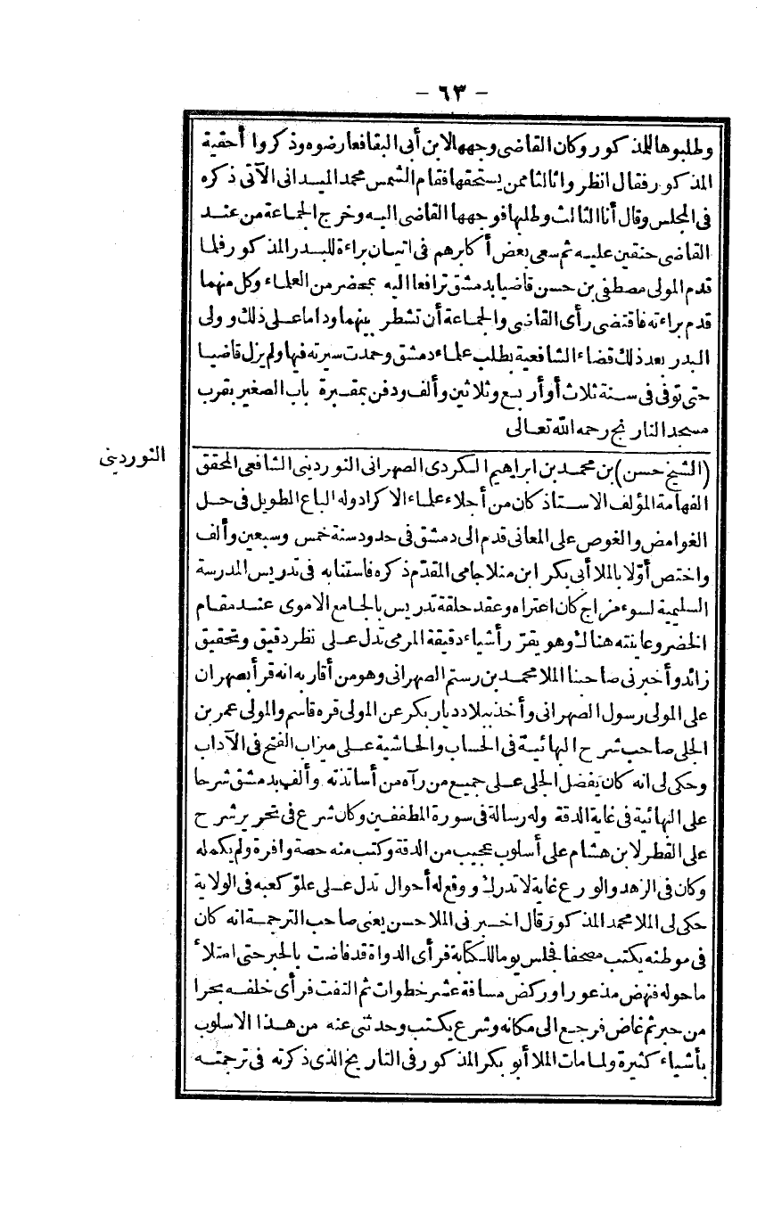 الشَّيْخ حسن بن مُحَمَّد بن إِبْرَاهِيم الْكرْدِي الصهراني النورديني الشَّافِعِي الْمُحَقق الفهامة الْمُؤلف الْأُسْتَاذ كَانَ من أجلاء عُلَمَاء الأكراد وَله الباع الطَّوِيل فِي حل الغوامض والغوص على الْمعَانِي قدم إِلَى دمشق فِي حُدُود سنة خمس وَسبعين وَألف واختص أَولا بالملا أبي بكر ابْن منلا جامي الْمُقدم ذكره فاستنابه فِي تدريس الْمدرسَة السليمية لسوء مزاج كَانَ اعتراه وَعقد حَلقَة تدريس بالجامع الْأمَوِي عِنْد مقَام الْخضر وعاينته هُنَاكَ وَهُوَ يُقرر أَشْيَاء دقيقة المرمى تدل على نظر دَقِيق وَتَحْقِيق زَائِد وَأَخْبرنِي صاحبنا الملا مُحَمَّد بن رستم الصهراني وَهُوَ من أَقَاربه أَنه قَرَأَ بصهران على الْمولى رَسُول الصهراني وَأخذ بِبِلَاد ديار بكر عَن الْمولى قره قَاسم وَالْمولى عمر بن الْجَلِيّ صَاحب شرح البهائية فِي الْحساب والحاشية على ميزاب الْفَتْح فِي الْآدَاب وَحكى لي أَنه كَانَ يفضل الْجَلِيّ على جَمِيع من رَآهُ من أساتذته وَألف بِدِمَشْق شرحا على البهائية فِي غَايَة الدقة وَله رِسَالَة فِي سُورَة المطففين وَكَانَ شرع فِي تَحْرِير شرح على الْقطر لِابْنِ هِشَام على أسلوب عَجِيب من الدقة وَكتب مِنْهُ حِصَّة وافرة وَلم يكمله وَكَانَ فِي الزّهْد والورع غَايَة لَا تدْرك وَوَقع لَهُ أَحْوَال تدل على علو كَعبه فِي الْولَايَة حكى لي الملا مُحَمَّد الْمَذْكُور وَقَالَ أَخْبرنِي الملا حسن يَعْنِي صَاحب التَّرْجَمَة انه كَانَ فِي موطنه يكْتب مُصحفا فَجَلَسَ يَوْمًا للكتابة فَرَأى الدواة قد فاضت بالحبر حَتَّى امْتَلَأَ مَا حوله فَنَهَضَ مذعورا وركض مَسَافَة عشر خطوَات ثمَّ الْتفت فَرَأى خَلفه بحرا من حبر ثمَّ غاض فَرجع إِلَى مَكَانَهُ وَشرع يكْتب وحَدثني عَنهُ من هَذَا الأسلوب بأَشْيَاء كَثِيرَة وَلما مَاتَ الملا أَبُو بكر الْمَذْكُور فِي التَّارِيخ الَّذِي ذكرته فِي تَرْجَمته