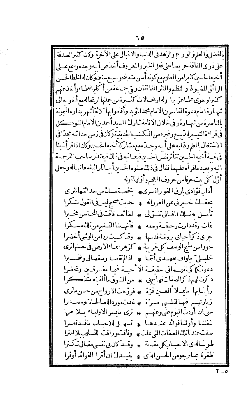 الْفضل وَالْعلم والورع والزهد فِي الدُّنْيَا والإقبال على الْآخِرَة وَكَانَ كثير الصَّدَقَة على ذَوي الْفَاقَة حَرِيصًا على فعل الْخَيْر وَالْمَعْرُوف أَخذ عَن أَبِيه وجده وَسمع على أَخِيه الْحُسَيْن كثيرا من الْعُلُوم مَعَ كَونه أسن مِنْهُ بِنَحْوِ سبع سِنِين وَكَانَ لَهُ الْخط الْحسن الرَّائِق المضبوط وَالنّظم والنثر الفائقان ولقى جمَاعَة من أكَابِر الْعلمَاء وَأخذ عَنْهُم كثيرا وحوى علما غزيرا وَله ارتحالات كَثِيرَة من جُمْلَتهَا ارتجاله مَعَ أَخَوَيْهِ إِلَى شهارة أَمَام دَعْوَة الْقَاسِم بن الإِمَام مُحَمَّد الْمُؤَيد وَأَقَامُوا بهَا ثَلَاثَة أشهر بداره الميمونة بالناصرة من شهارة فِي خلال الْإِقَامَة شَارك السَّيِّد أَحْمد بن الإِمَام المتَوَكل فِي قِرَاءَة التَّيْسِير للديبع وَغَيره من الْكتب الحديثية وَكَانَ فِي زمن حداثته مجدا فِي الِاشْتِغَال بِالْعلمِ وَطَلَبه على أَبِيه وجده مَعَ مُشَاركَة أَخِيه الْحُسَيْن وَكَانَ إِذا قَرَأَ شَيْئا فِي غيبَة أَخِيه الْحُسَيْن تتأثر نفس الْحُسَيْن فيعاتبه فِي ذَلِك فيعتذر صَاحب التَّرْجَمَة إِلَيْهِ وَيُعِيد مَا قَرَأَهُ عَلَيْهِمَا فَقَالَ فِي ذَلِك صنوه الْحُسَيْن أبياتا رائية معاتبا لَهُ وَجعل أول كل بَيت حرفا من حُرُوف الْعَجم وأولها قَوْله