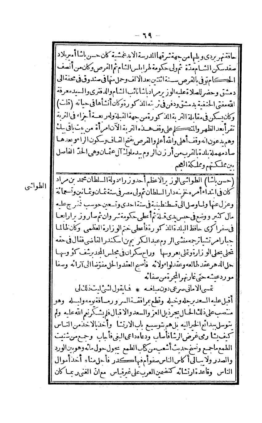حسن باشا الطواشي الْوَزير الْأَعْظَم أحد وزراء دولة السُّلْطَان مُحَمَّد بن مُرَاد كَانَ فِي ابْتِدَاء أَمر خزينه دَار السُّلْطَان ثمَّ ولي مصر فِي سنة ثَمَان وَثَمَانِينَ وَتِسْعمِائَة وعزل عَنْهَا وَلما وصل إِلَى قسطنطينية فِي سنة إِحْدَى وَتِسْعين حُوسِبَ فَخرج عَلَيْهِ مَال كثير وَوضع فِي حبس يَدي قلَّة ثمَّ أعْطى حُكُومَة شرْوَان ثمَّ صَار وزيرا رَابِعا فِي سفراكرى حَافظ الْبَلدة الْمَذْكُورَة فَأعْطى ختم الوزارة الْعُظْمَى وَكَانَ ظَالِما جبارا مرتشيا تَرْجمهُ منشى الرّوم عبد الْكَرِيم بن اسكندر القَاضِي فَقَالَ فِي حَقه تحلى بحلى الوزارة وتملى بعروسها وراج سَكرَان فِي مجْلِس الْمجد برشف كؤوسها حل الدَّهْر عقد طالعه وَعقد لِوَاء ولائه فَأصْبح العقد والحل مفوضا إِلَى آرائه وَصفا مورد عيشه حَتَّى غَار نهر المجرة من صِفَاته