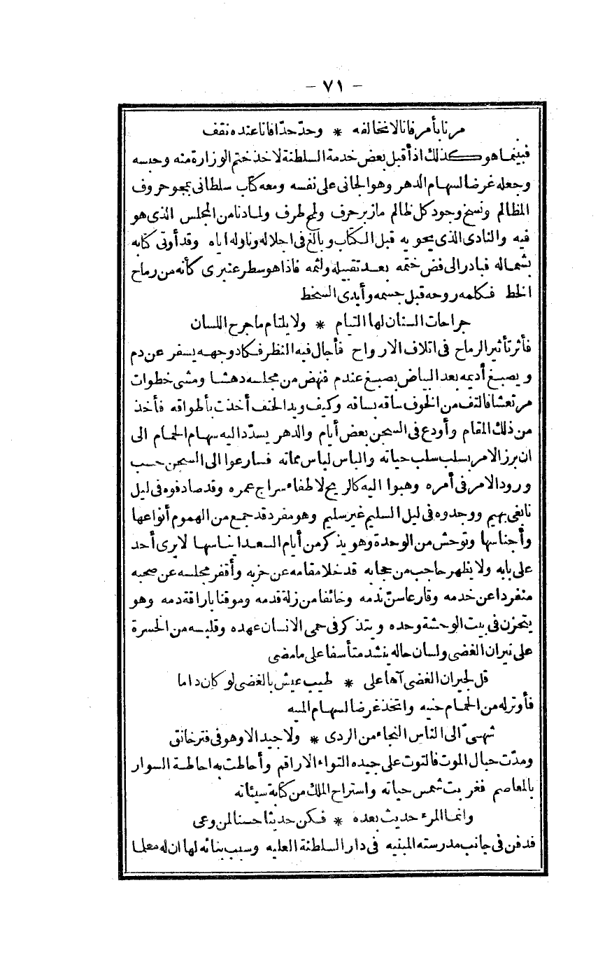 فأثر تَأْثِير الرماح فِي اتلاف الْأَرْوَاح فأجال فِيهِ النّظر فكاد وَجهه يسفر عَن دم ويصبغ أديمه بعض الْبيَاض بصبغ عندم فَنَهَضَ من مَجْلِسه دهشاً وَمَشى خطوَات مرتعشاً فالتف من الْخَوْف سَاقه بساقه وَكَيف وَيَد الحنف أخذت بأطواقه فَأخذ من ذَلِك الْمقَام وأودع فِي السجْن بعض أَيَّام والدهر يسدد إِلَيْهِ سِهَام الْحمام إِلَى أَن برز الْأَمر بسلب سلب حَيَاته والباس لِبَاس مماته فسارعوا إِلَى السجْن حسب وُرُود الْأَمر فِي أمره وهبوا إِلَيْهِ كَالرِّيحِ لاطفاء سراج عمره وَقد صادفوه فِي ليل نابغي بهيم ووجدوه فِي ليل السَّلِيم غير سليم وَهُوَ مُفْرد قد جمع من الهموم أَنْوَاعهَا وأجناسها وتوحش من الْوحدَة وَهُوَ يذكر من أَيَّام السعد إيناسها لَا يرى أحد على بَابه وَلَا يظْهر حَاجِب من حجابه قد خلا مقَامه عَن خربه وأقفر مَجْلِسه عَن صَحبه مُنْفَردا عَن خدمَة وقارعاً سنّ ندمه وخائفاً من زلَّة قدمه وموقناً بإراقة دَمه وَهُوَ يتحزن فِي بَيت الوحشة وَحده ويتذكر فِي حمى الْإِنْسَان عَهده وَقَلبه من الْحَسْرَة على نيران الغضى ولسان حَاله ينشد متأسفاً على مَا مضى