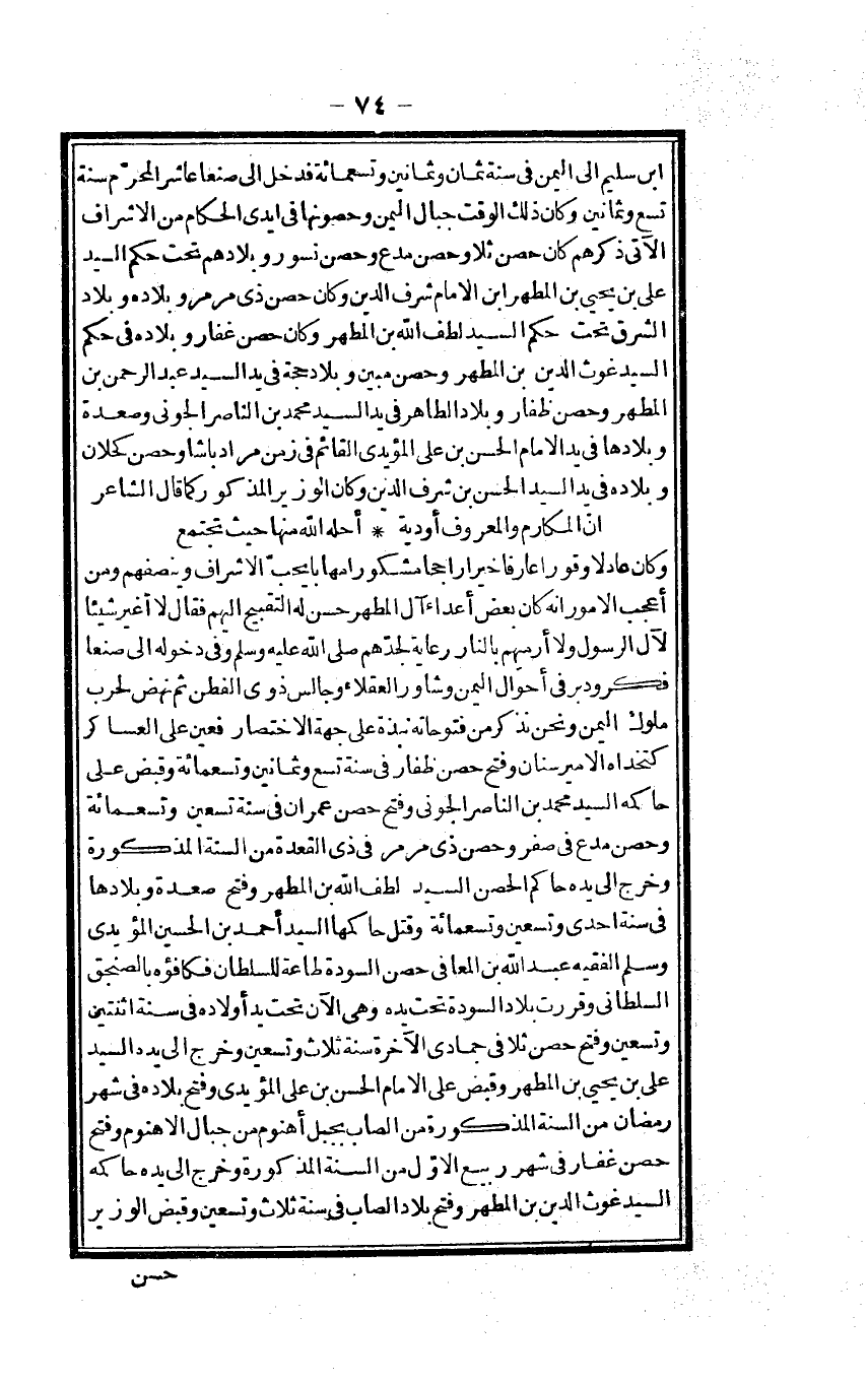 وَكَانَ عادلا وقورا عَارِفًا خيرا راجحا مشكورا مها بايحت الْأَشْرَاف وينصفهم وَمن أعجب الْأُمُور أَنه كَانَ بعض أَعدَاء آل المطهر حسن لَهُ التقبيح إِلَيْهِم فَقَالَ لَا أغير شَيْئا لآل الرَّسُول وَلَا أرميهم بالنَّار رِعَايَة لجدهم