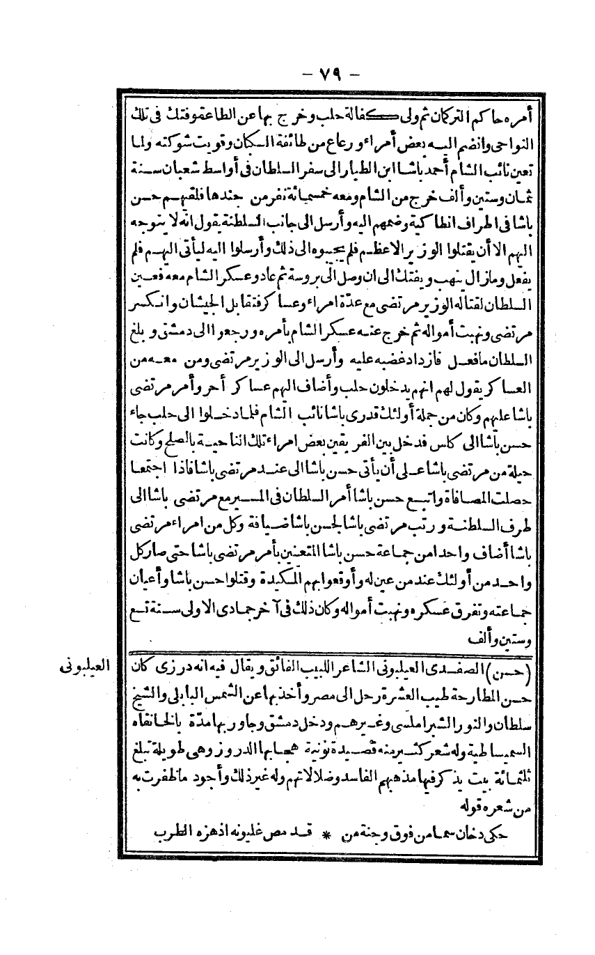 حسن الصَّفَدِي العيلبوني الشَّاعِر اللبيب الْفَائِق وَيُقَال فِيهِ أَنه درزي كَانَ حسن المطارحة طيب الْعشْرَة رَحل إِلَى مصر وَأخذ بهَا عَن الشَّمْس البابلي وَالشَّيْخ سُلْطَان والنور والشبراملسي وَغَيرهم وَدخل دمشق وجاور بهَا مُدَّة بالخانقاه السمياسطية وَله شعر كثير مِنْهُ قصيدة نونية هجا بهَا الدروز وَهِي طَوِيلَة تبلغ ثلثمِائة بَيت يذكر فِيهَا مَذْهَبهم الْفَاسِد وضلالاتهم وَله غير ذَلِك وأجود مَا ظَفرت بِهِ من شعره قَوْله