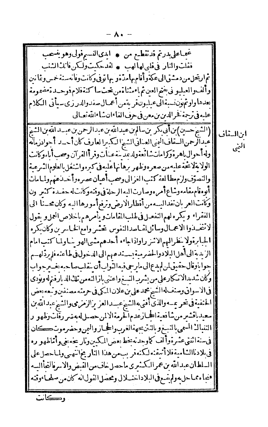 الشَّيْخ حُسَيْن بن أبي بكر بن سَالم بن عبد الله بن عبد الرَّحْمَن بن عبد الله بن الشَّيْخ عبد الرَّحْمَن السقاف اليمني العناتي الشَّيْخ الْكَبِير الْعَارِف كَانَ أحد أجواد زَمَانه وَله أَحْوَال باهرة وكرامات شائعة ولد بِمَدِينَة عينات وَقَرَأَ الْقُرْآن وَصَحب أَبَاهُ وَكَانَت الْولَايَة لائحة عَلَيْهِ من صغره وَظهر برهانها عَلَيْهِ فِي كبره واشتغل بالعلوم الشَّرْعِيَّة والتصوف وَلزِمَ مطالعة كتب الْغَزالِيّ وَصَحب أَعْيَان عصره وَأخذ عَنْهُم وَلما مَاتَ أَبوهُ قَامَ مقَامه وشاع أمره وَصَارَت إِلَيْهِ الرحلة فِي وقته وَكَانَت لَهُ حفدة كَثِيرُونَ وَكَانَت العربان تفد اليه من أقطار الأَرْض وترفع أمورها إِلَيْهِ وَكَانَ محسنا إِلَى الْفُقَرَاء وَيكرهُ لَهُم التفعل فِي طلب المقامات وَيَأْمُرهُمْ بإخلاص الْعَمَل وَيَقُول لَا تَتَّخِذُوا الْأَعْمَال وَسَائِل لمقاصد النُّفُوس تُحشرُوا مَعَ الخاسرين وَكَانَ يكره الْجَبَابِرَة وَلَا ينظر إِلَيْهِم الأشزرا وَإِذا جاءهوا أحدهم مَشى الهوينا وَلما كتب إِمَام الزيدية إِلَى أهل الْبِلَاد والخضرمية يستدعيهم إِلَى الدُّخُول فِي طَاعَته فَلم يرد لَهُم جَوَابا وَقَالَ حقيق لمن لم يدع إِلَى مَا يُرْجَى فِيهِ الثَّوَاب أَن يَنْقَلِب صَاحبه بِغَيْر جَوَاب وَكَانَ شَدِيد الْإِنْكَار على من يشرب التبغ واعتنى بإزالته من تِلْكَ الديار فتم لَهُ وَنُودِيَ فِي الْأَسْوَاق وصنف لَهُ الشَّيْخ مُحَمَّد عَليّ بن عَلان الْمَكِّيّ فِي حرمته مصنفين وَتَبعهُ بعض الْحَنَفِيَّة فِي تَحْرِيمه وَالَّذِي أفتى بِهِ الشَّيْخ عبد الْعَزِيز الزمزمي وَالشَّيْخ عبد الله بن سعيد باقشير من شافعية الْحجاز وَعدم الْحُرْمَة إِلَّا لمن حصل لَهُ بِهِ ضَرَر قلت وَظُهُور التنباك الْمُسَمّى بالتبغ وبالتتن بِجِهَة الغرب والحجاز واليمن وحضرموت كَانَ فِي سنة اثْنَتَيْ عشرَة وَألف كَمَا وجدته بِخَط بعض المكيين وتاريخه بغى وَأما ظُهُوره فِي بِلَادنَا الشامية فَلَا أتيقنه لكنه قريب من هَذَا التَّارِيخ انْتهى وَلما حصل على السُّلْطَان عبد الله بن عمر الكثيري مَا حصل خَافَ من الْقَبْض والأسرة التجأ إِلَيْهِ فَنَجَّاهُ مِمَّا حل بِهِ وَلم يَقع فِي الْبِلَاد اختلال ومحصل القَوْل أَنه كَانَ من صلحاء وقته