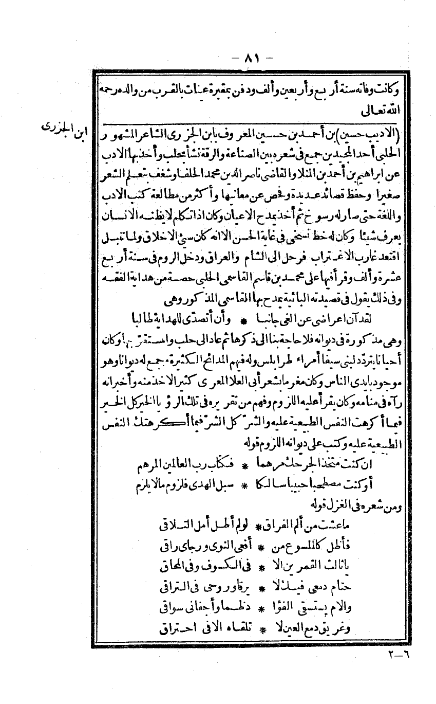 الأديب حُسَيْن بن أَحْمد بن حُسَيْن الْمَعْرُوف بِابْن الْجَزرِي الشَّاعِر الْمَشْهُور الْحلَبِي أحد المجيدين جمع فِي شعره بَين الصِّنَاعَة والرقة نَشأ بحلب وَأخذ بهَا الْأَدَب عَن إِبْرَاهِيم بن أَحْمد بن المنلا وَالْقَاضِي نصر الدّين مُحَمَّد الحلفا وشغف بتَعَلُّم الشّعْر صَغِيرا وَحفظ قصائد عديدة وفحص عَن مَعَانِيهَا وَأكْثر من مطالعة كتب الْأَدَب واللغة حَتَّى صَار لَهُ رسوخ ثمَّ أَخذ يمدح الْأَعْيَان وَكَانَ إِذا تكلم لَا يَظُنّهُ الْإِنْسَان يعرف شَيْئا وَكَانَ لَهُ خطّ نسخي فِي غَايَة الْحسن إِلَّا أَنه كَانَ سيء الْأَخْلَاق وَلما تنبل اقتعد غارب الأغتراب فَرَحل إِلَى الشَّام وَالْعراق وَدخل الرّوم فِي سنة أَربع عشرَة وَألف وَقَرَأَ فِيهَا على مُحَمَّد بن قَاسم القاسمي الْحلَبِي حِصَّة من هِدَايَة الْفِقْه وَفِي ذَلِك بقول فِي قصيدته البائية يمدح بهَا القاسمي الْمَذْكُور وَهِي