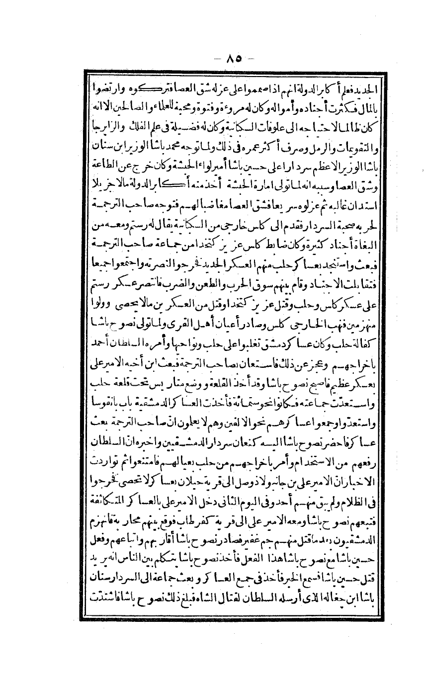 الْجَدِيد فلعلم أكَابِر الدولة أَنهم إِذا صمموا على عَزله شقّ العصافير فَتَرَكُوهُ وارتضوا بِالْمَالِ فكثرت أجناده وأمواله وَكَانَ لَهُ مُرُوءَة وفتوة ومحبة للْعُلَمَاء وَالصَّالِحِينَ إِلَّا أَنه كَانَ ظَالِما لاحتياجه إِلَى علوفات السبكانية وَكَانَ لَهُ فَضِيلَة فِي علم المفلك والرايرجا والتقويمات والرمل وَصرف أَكثر عمره فِي ذَلِك وَلما توجه مُحَمَّد باشا الْوَزير ابْن سِنَان باشا الْوَزير الْأَعْظَم سردارا على حُسَيْن باشا أَمِير لِوَاء الْحَبَشَة وَكَانَ خرج عَن الطَّاعَة وشق الْعَصَا وَسَببه أَنه لما تولى إِمَارَة الْحَبَشَة أَخذ مِنْهُ أكَابِر الدولة مَالا جزيلاً اسْتَدَانَ غالبه ثمَّ عزلوه سَرِيعا فشق الْعَصَا مغاصباً لَهُم فَتوجه صَاحب التَّرْجَمَة لحربه صُحْبَة السردار فَقدم إِلَى كاس خارجي من السبكانية يُقَال لَهُ رستم وَمَعَهُ من الْبُغَاة أجناد كَثِيرَة وَكَانَ ضَابِط كاس عَزِيز كتخدا من جمَاعَة صَاحب التَّرْجَمَة فَبعث واستنجد بعساكر حلب مِنْهُم الْعَسْكَر الْجَدِيد فَخَرجُوا لنصرته واجتمعوا جَمِيعًا فتقابلت الأجناد وَقَامَ بَينهم سوق الْحَرْب والطعن وَالضَّرْب فانتصر عَسْكَر رستم على عَسْكَر كاس وحلب وَقتل عَزِيز كتخدا وَقتل من العسكرين مَا لَا يُحْصى وولوا منهزمين فنهب الْخَارِجِي كلس وصادر أَعْيَان أهل الْقرى وَلما تولى نصوح باشا كَفَالَة حلب وَكَانَ عَسَاكِر دمشق تغلبُوا على حلب ونواحيها وَأمره السُّلْطَان أَحْمد بإخراجهم وَعجز عَن ذَلِك فاستعان بِصَاحِب التَّرْجَمَة فَبعث ابْن أَخِيه الْأَمِير عَليّ بعسكر عَظِيم فَأصْبح نصوح باشا وَقد أَخذ القلعة وَوضع متاريس تَحت قلعة حلب واستعدت جماعته فَكَانُوا نَحْو سِتّمائَة فَأخذت العساكر الدمشقية بَاب بانقوسا واستعدوا وجمعوا عساكرهم نَحْو الْأَلفَيْنِ وهم لَا يعلمُونَ أَن صَاحب التَّرْجَمَة بعث عَسَاكِر فَاحْضُرْ نصوح باشا إِلَيْهِ كنعان سردار الدمشقيين وَأخْبرهُ أَن السُّلْطَان رفعهم من الِاسْتِخْدَام وَأمر بإخراجهم من حلب بعيالهم فامتنعوا ثمَّ تواردت الْأَخْبَار أَن الْأَمِير عَليّ بن جَانِبه ولاذ وصل إِلَى قَرْيَة حيلان بعساكر لَا تحصى فَخَرجُوا فِي الظلام وَلم يبْق مِنْهُم اُحْدُ وَفِي الْيَوْم الثَّانِي دخل الْأَمِير على العساكر المتكاثقة فَتَبِعهُمْ نصوح باشا وَمَعَهُ الْأَمِير عَليّ إِلَى قَرْيَة كفر طَابَ فَوَقع بَينهم محاربه فَانْهَزَمَ الدمشقيون بعد مَا قتل مِنْهُم جم غفير فصادر نوح باشا أقاربهم وأتباعهم وَفعل حُسَيْن باشا مَعَ نصوح باشا هَذَا الْفِعْل فَأخذ نصوح باشا يتَكَلَّم بَين النَّاس أَنه يُرِيد قتل حُسَيْن باشا فَسمع الْخَبَر فَأخذ فِي جمع العساكر وَبعث جمَاعَة إِلَى السردار جارسنان باشا ابْن جغاله الَّذِي أرْسلهُ السُّلْطَان لقِتَال الشاه فَبلغ ذَلِك نصوح باشا فاشتدت
