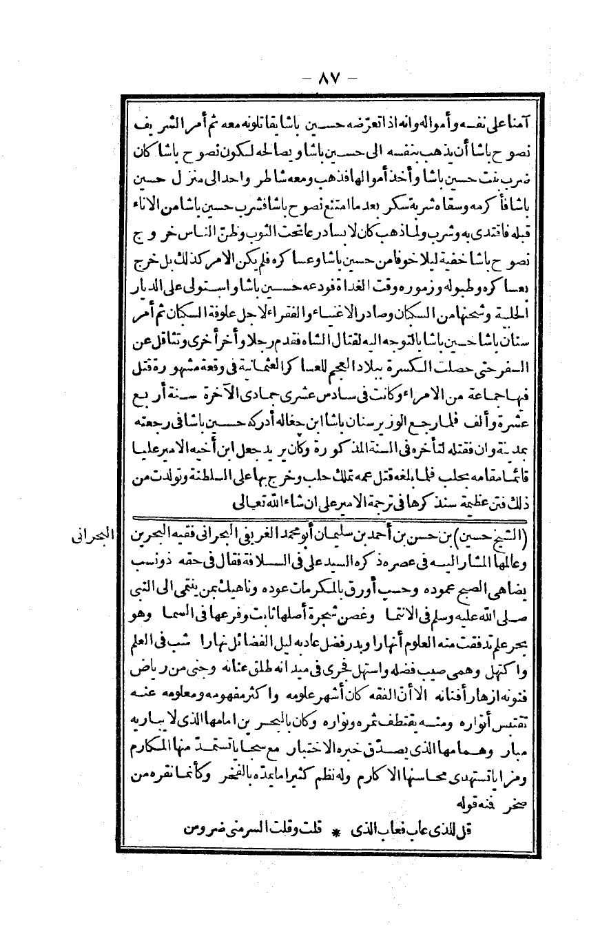 فِي الأنتما وغصن شَجَرَة أَصْلهَا ثَابت وفرعها فِي السما وَهُوَ بَحر علم تدفقت مِنْهُ الْعُلُوم أَنهَارًا وَبدر فضل عادبه ليل الْفَضَائِل نَهَارا شب فِي الْعلم واكتهل وهمي صيب فَضله واستهل فَجرى فِي ميدانه انه طلق عنانه وجنى من رياض فنونه أزهار أفنانه إِلَّا أَن الْفِقْه كَانَ أشهر علومه وَأكْثر مَفْهُومه ومعلومه عَنهُ تقتبس أنواره وَمِنْه يقتطف ثمره ونواره وَكَانَ بِالْبَحْرَيْنِ إمامها الَّذِي لَا يباريه مبار وهمامها الَّذِي يصدق خَبره الاختبار مَعَ سجايا تستمد مِنْهَا المكارم ومزايا تستهدي محاسنها الأكارم وَله نظم كثيرا مَا يمده بالفخر وكأنما نقره من صَخْر فَمِنْهُ قَوْله