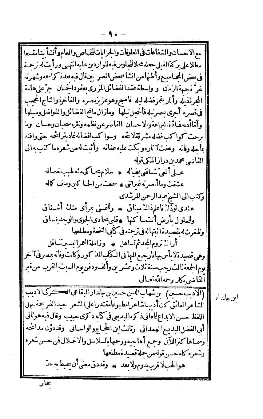 الأديب حُسَيْن بن شهَاب الدّين حُسَيْن بن جاندار البقاعي الكركي الأديب الشَّاعِر العائق كَانَ أديبا شَاعِرًا مطبوعا مقتدرا على الشّعْر جيد القريحة سهل اللَّفْظ حسن الإبداع للمعاني ذكره البديعي فِي كِتَابه ذكرى حبيب وَقَالَ فِيهِ هُوَ ثَانِي أبي الْفضل البديع الْهَمدَانِي وثالث ابْن الْحجَّاج والواساني وَقد دون مدائحه وسماها كنز اللآل وَجمع أهاجيه ووسمها بالسلاسل والأغلال فَمن حسن شعره وشعره كُله حسن قَوْله من جملَة قصيدة مطْلعهَا