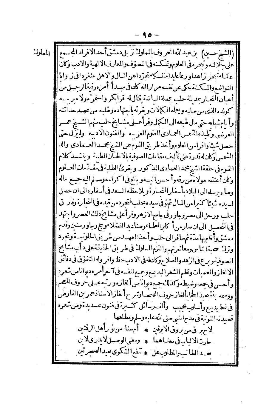 الشَّيْخ حُسَيْن بن عبد الله الْمَعْرُوف بالمملوك نزيل دمشق أحد الْأَفْرَاد الْمجمع على جلالته وتبحره فِي الْعُلُوم وتمكنه فِي التصوف والمعارف الألهية وَالْأَدب وَكَانَ عَالما متجرا زاهدا ورعا عابدا منتسكا متجردا عَن المَال والأهل مُنْفَرد فِي زَوَايَا التَّوَاضُع والمسكنة حكى عَن نَفسه مرَارًا أَنه كَانَ فِي مبدأ أمره رَقِيقا لرجل من أَعْيَان التُّجَّار بِمَدِينَة حلب بمحلة البياضة يُقَال لَهُ قرابكر وَاسْتمرّ مَوْلَاهُ يربيه كولده الَّذِي من صلبه ويعلمه الكمالات ويقرئه بإجتهاد وَطَلَبه من عهد حداثته وَأَيَّام شبابه حَتَّى مَال طبعه إِلَى الْكَمَال وَقَرَأَ على مَشَايِخ حلب مِنْهُم الشَّيْخ عمر العرضي وتلميذه الشَّمْس الْعِمَادِيّ الْعُلُوم الْعَرَبيَّة والفنون الأدبية وَلم يزل حَتَّى حصل شَيْئا وافراً من الْعُلُوم وَأخذ طَرِيق الْقَوْم عَن الشَّيْخ مُحَمَّد الْعِمَادِيّ وَالِد الشَّمْس وَكَانَ لَهُ قدرَة على تأليف مقامات الصُّوفِيَّة بالألحان الطبية وينشد كَلَام الْقَوْم فِي حَلقَة الشَّيْخ مُحَمَّد الْعِمَادِيّ الْمَذْكُور ويقرئ الطّلبَة فِي مُقَدمَات الْعُلُوم وَكَانَ أعْتقهُ مَوْلَاهُ من رقّه وَأحسن إِلَيْهِ وَبَالغ فِي إكرامه وَسلم إِلَيْهِ جَمِيع مَاله وَصَارَ يُرْسِلهُ إِلَى الْبِلَاد بأسفار التِّجَارَة ويلاحظه السعد فِي أَسْفَاره إِلَى أَن حصل لسَيِّده شَيْئا كثيرا من المَال ثمَّ توفّي سَيّده بحلب فتجرد من قَيده فِي التِّجَارَة وَفَارق حلب ورحل إِلَى مصر وجاور فِي جَامع الْأَزْهَر وَقَرَأَ على مَشَايِخ ذَلِك الْعَصْر واجتهد فِي التَّحْصِيل إِلَى أَن صَار من أكَابِر الْعلمَاء وصناديد الْفُضَلَاء وَحج وجاور سِنِين وَقدم دمشق وَأقَام بهَا مُدَّة ثمَّ سَافر إِلَى حلب وَأخذ الْعَهْد من طريف الخلوتية وتجرد وَترك صُحْبَة النَّاس ومعاشرتهم وَالْتزم السلوك فِي طَرِيق الْحَقِيقَة على دأب مَشَايِخ الصُّوفِيَّة وبرع فِي الزّهْد وَالصَّلَاح وَكَانَ لَهُ فِي الْأَدَب حَظّ وافر وَله التفوق فِي دقائق الألغاز والمعميات ونظم الشّعْر البديع وَجمع لنَفسِهِ فِي آخر أمره ديوانا من شعره وَأحسن فِي جمعه وَضَبطه وَكَذَلِكَ جَمِيع ديوانا من ألغازه ورتبه على حُرُوف المعجم ووسمه بتشحيذ الحجا بألغاز حُرُوف الهجاء وَشرح ألغاز الْأُسْتَاذ عمر بن الفارض فِي نمط بديع وأسلوب عَجِيب وَألف رسائل كَثِيرَة فِي فنون عديدة وَمن شعره قصيدته النونية فِي مدح النَّبِي
