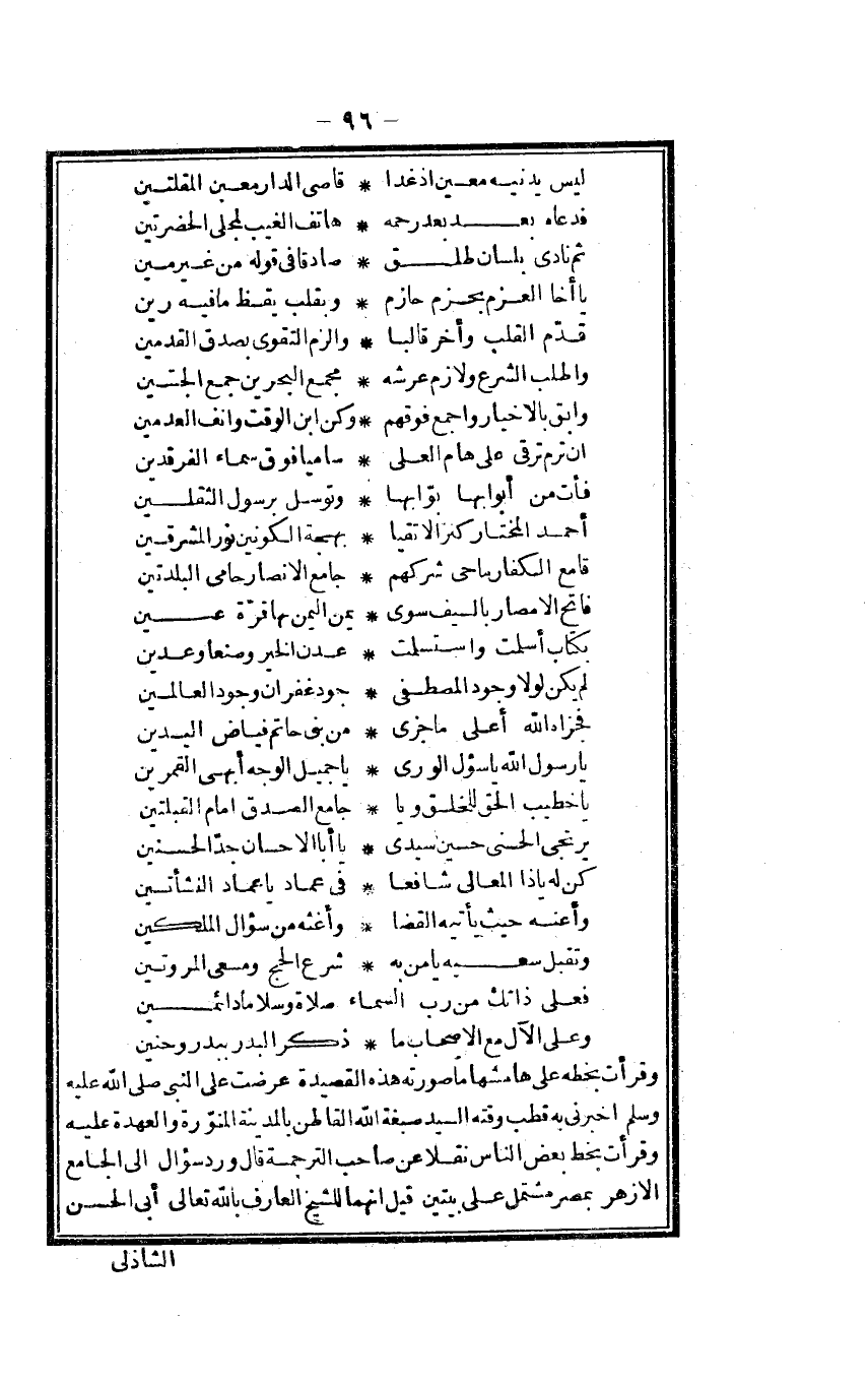 أَخْبرنِي بِهِ قطب وقته السَّيِّد صبغة الله القاطن بِالْمَدِينَةِ المنورة والعهدة عَلَيْهِ وقرأت بِخَط بعض النَّاس نقلا عَن صَاحب التَّرْجَمَة قَالَ ورد سُؤال إِلَى الْجَامِع الْأَزْهَر بِمصْر مُشْتَمل على بَيْتَيْنِ قيل أَنَّهُمَا للشَّيْخ الْعَارِف بِاللَّه تَعَالَى أبي الْحسن
