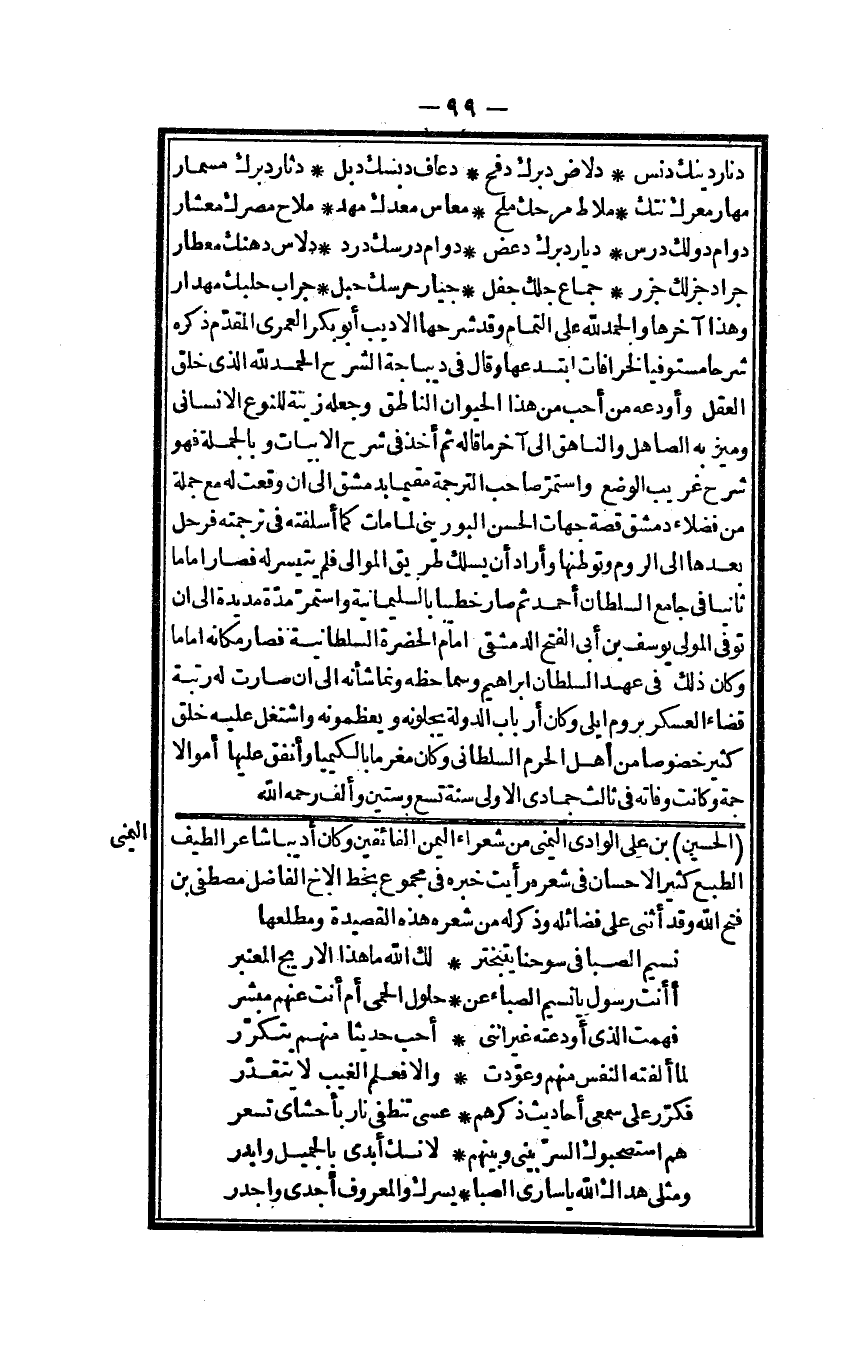 دنار دينك دنس دلاض دبرك دفح دعاف دبسك دبل دثار دبرك مِسْمَار مهار معرك نتك ملاط مرحك ملح معاس معدك مهد ملاح مصرك معشار دوَام دولك درس ديار دبرك دعض دوَام درسك درد دلاس دهنك معطار جَراد جزلك جزر جماع جلك جفل جيار حرسك حَبل جراب حلبك مهدار وَهَذَا آخرهَا وَالْحَمْد لله على التَّمام وَقد شرحها الأديب أَبُو بكر الْعمريّ الْمُقدم ذكره شرحا مُسْتَوْفيا لخرافات ابتدعها وَقَالَ فِي ديباجة الشَّرْح الْحَمد لله الَّذِي خلق الْعقل وأودعه من أحب من هَذَا الْحَيَوَان النَّاطِق وَجعله زِينَة للنوع الإنساني وميز بِهِ الصاهل والناهق إِلَى آخر مَا قَالَه ثمَّ أَخذ فِي شرح الأبيات وَبِالْجُمْلَةِ فَهُوَ شرح غَرِيب الْوَضع وَاسْتمرّ صَاحب التَّرْجَمَة مُقيما بِدِمَشْق إِلَى أَن وَقعت لَهُ مَعَ جملَة من فضلاء دمشق قصَّة جِهَات الْحسن البوريني لما مَاتَ كَمَا أسلفته فِي تَرْجَمته فَرَحل بعْدهَا إِلَى الرّوم وتوطنها وَأَرَادَ أَن يسْلك طَرِيق الموَالِي فَلم يَتَيَسَّر لَهُ فَصَارَ إِمَامًا ثَانِيًا فِي جَامع السُّلْطَان أَحْمد ثمَّ صَار خَطِيبًا بالسليمانية وَاسْتمرّ مُدَّة مديدة إِلَى أَن توفّي الْمولى يُوسُف بن أبي الْفَتْح الدِّمَشْقِي إِمَام الحضرة السُّلْطَانِيَّة فَصَارَ مَكَانَهُ إِمَامًا وَكَانَ ذَلِك فِي عهد السُّلْطَان إِبْرَاهِيم وسما حَظه ونما شَأْنه إِلَى أَن صَارَت لَهُ رُتْبَة قَضَاء الْعَسْكَر بروم إيلي وَكَانَ أَرْبَاب الدولة يجلونه ويعظمونه واشتغل عَلَيْهِ خلق كثير خُصُوصا من أهل الْحرم السلطاني وَكَانَ مغرما بالكيماء وَأنْفق عَلَيْهَا أَمْوَالًا جمة وَكَانَت وَفَاته فِي ثَالِث جُمَادَى الأولى سنة تسع وَسِتِّينَ وَألف رَحمَه الله