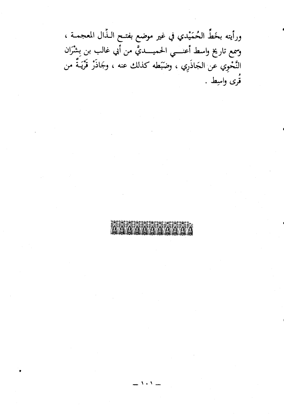ورأيته بِخَط الْحميدِي فِي غير مَوضِع بِفَتْح الذَّال الْمُعْجَمَة وَسمع تَارِيخ وَاسِط أَعنِي الْحميدِي من ابي غَالب بن بَشرَان النَّحْوِيّ عَن الجاذري وَضَبطه كَذَلِك عَنهُ وجاذر قَرْيَة من قرى وَاسِط