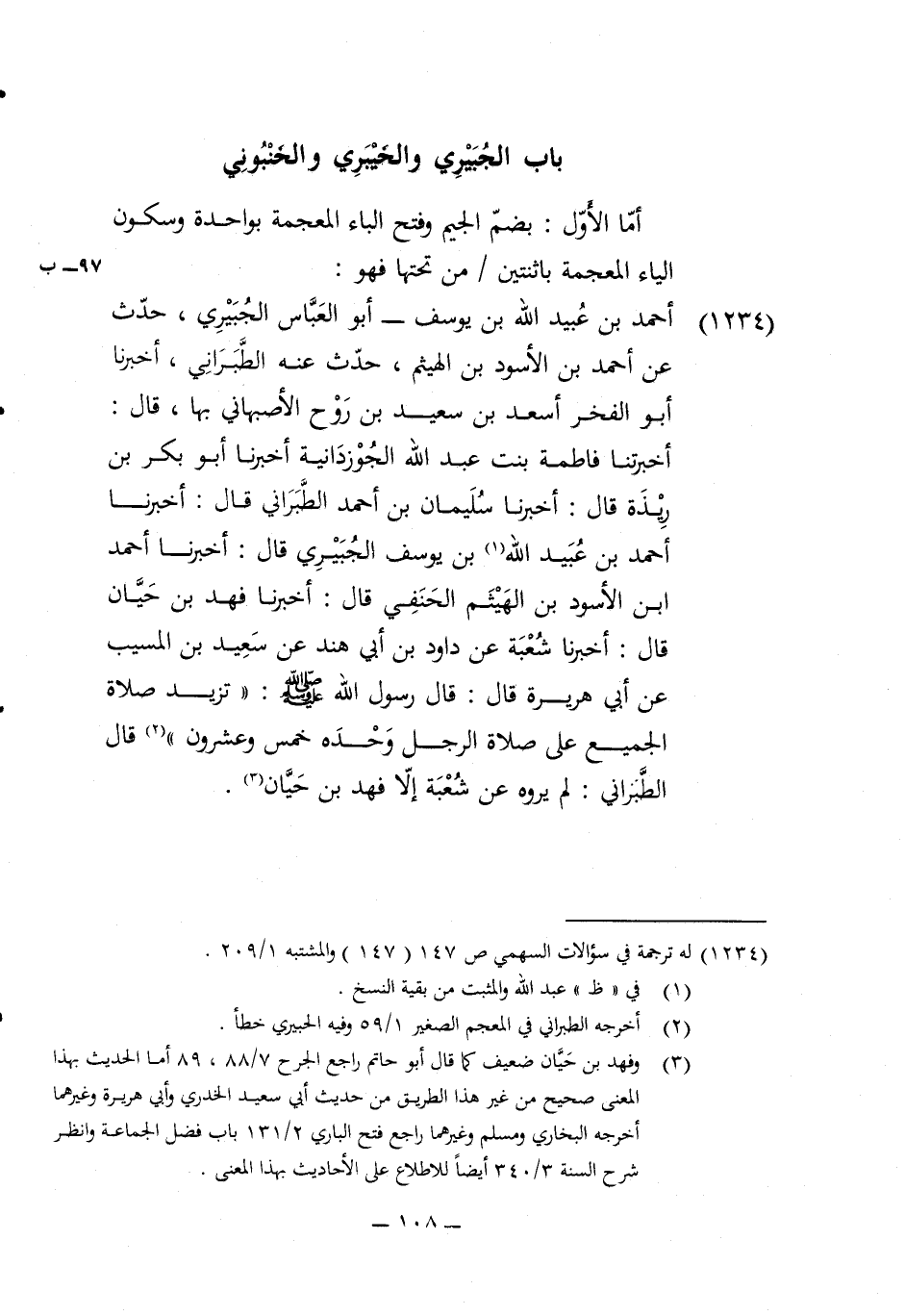 1234 - أَحْمد بن عبيد الله بن يُوسُف أَبُو الْعَبَّاس الجبيري حدث عَن أَحْمد بن الْأسود بن الْهَيْثَم حدث عَنهُ الطَّبَرَانِيّ أخبرنَا أَبُو الْفَخر أسعد بن سعيد بن روح الْأَصْبَهَانِيّ بهَا قَالَ اخبرتنا فَاطِمَة بنت عبد الله الجوزدانية أخبرنَا أَبُو بكر بن ريذة قَالَ أخبرنَا سُلَيْمَان بن أَحْمد الطَّبَرَانِيّ قَالَ أخبرنَا أَحْمد بن عبيد الله بن يُوسُف الجبيري قَالَ أخبرنَا أَحْمد ابْن الْأسود بن الْهَيْثَم الْحَنَفِيّ قَالَ أخبرنَا فَهد بن حَيَّان قَالَ أخبرنَا شُعْبَة عَن دَاوُد بن أبي هِنْد عَن سعيد بن الْمسيب عَن أبي هُرَيْرَة قَالَ قَالَ رَسُول الله صلى الله عَلَيْهِ وَسلم تزيد صَلَاة الْجَمِيع على صَلَاة الرجل وَحده خمس وَعِشْرُونَ قَالَ الطَّبَرَانِيّ لم يروه عَن شُعْبَة إِلَّا فَهد بن حَيَّان
