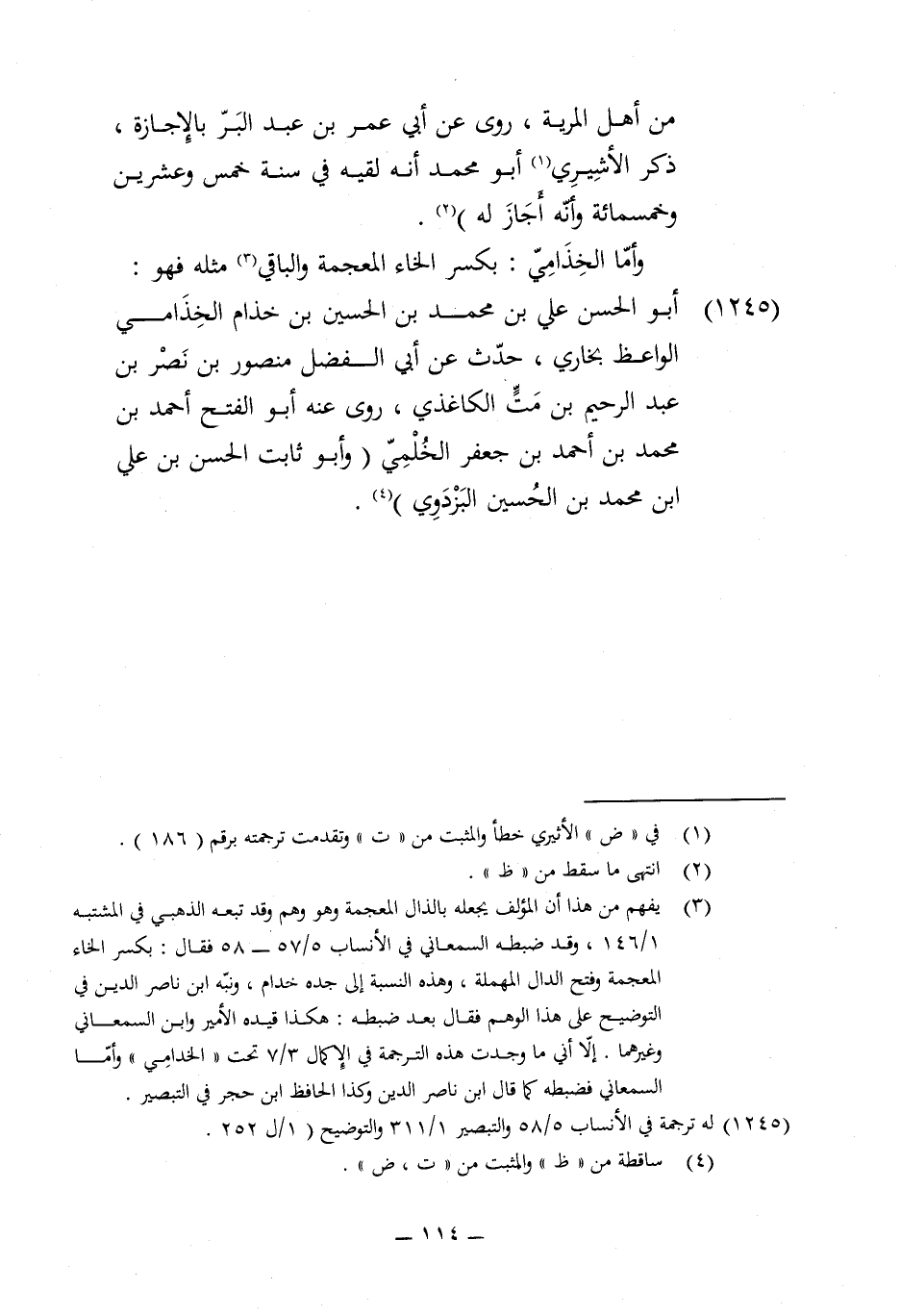 1245 - أَبُو الْحسن عَليّ بن مُحَمَّد بن الْحُسَيْن بن خذام الخذامي الْوَاعِظ بخاري حدث عَن أبي الْفضل مَنْصُور بن نصر بن عبد الرَّحِيم بن مت الكاغذي روى عَنهُ أَبُو الْفَتْح أَحْمد بن مُحَمَّد بن احْمَد بن جَعْفَر الخلمي وَأَبُو ثَابت الْحسن بن عَليّ ابْن مُحَمَّد بن الْحُسَيْن الْبَزْدَوِيّ