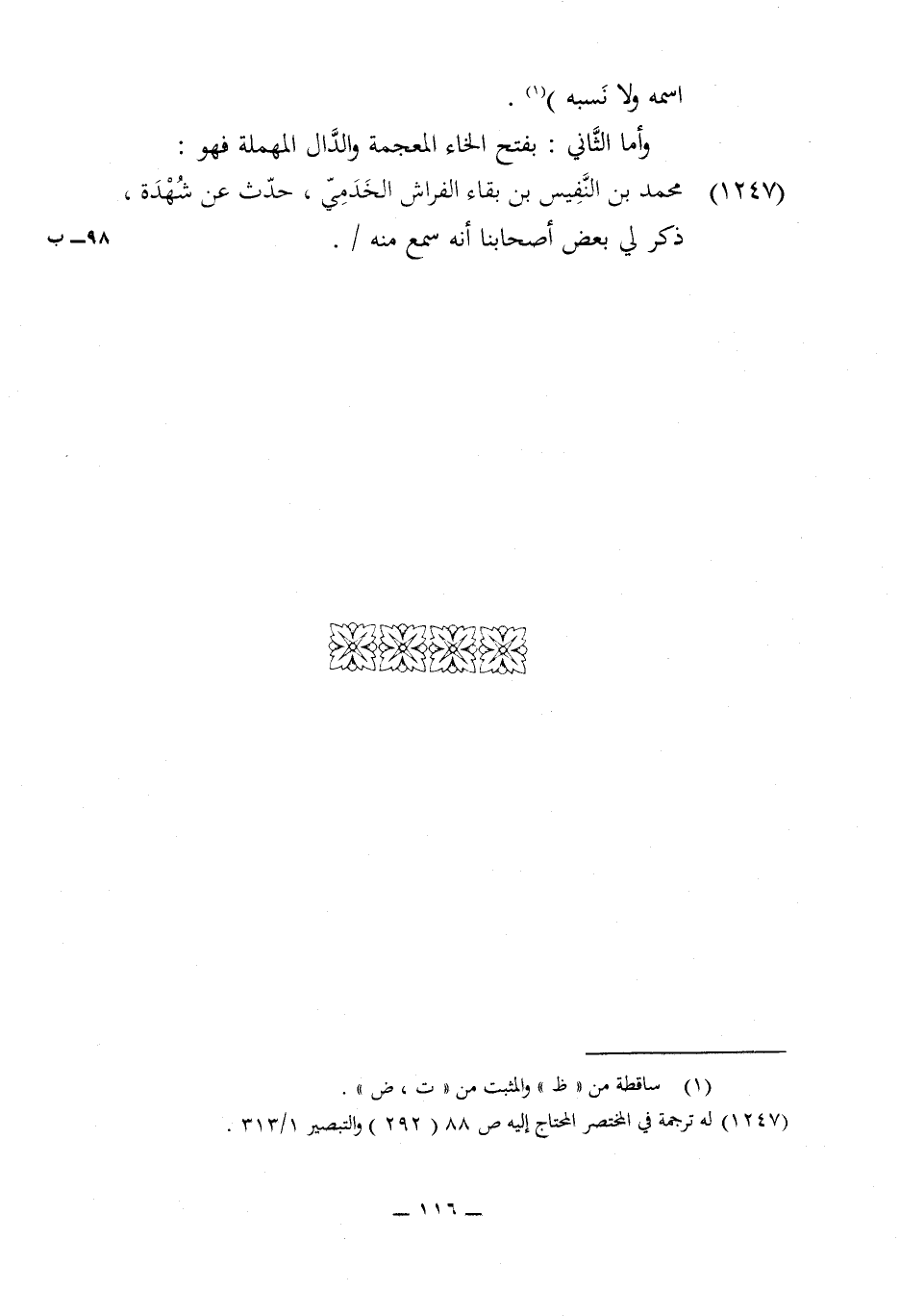 1247 - مُحَمَّد بن النفيس بن بَقَاء الْفراش الخذمي حدث عَن شهدة ذكر لي بعض أَصْحَابنَا أَنه سمع مِنْهُ