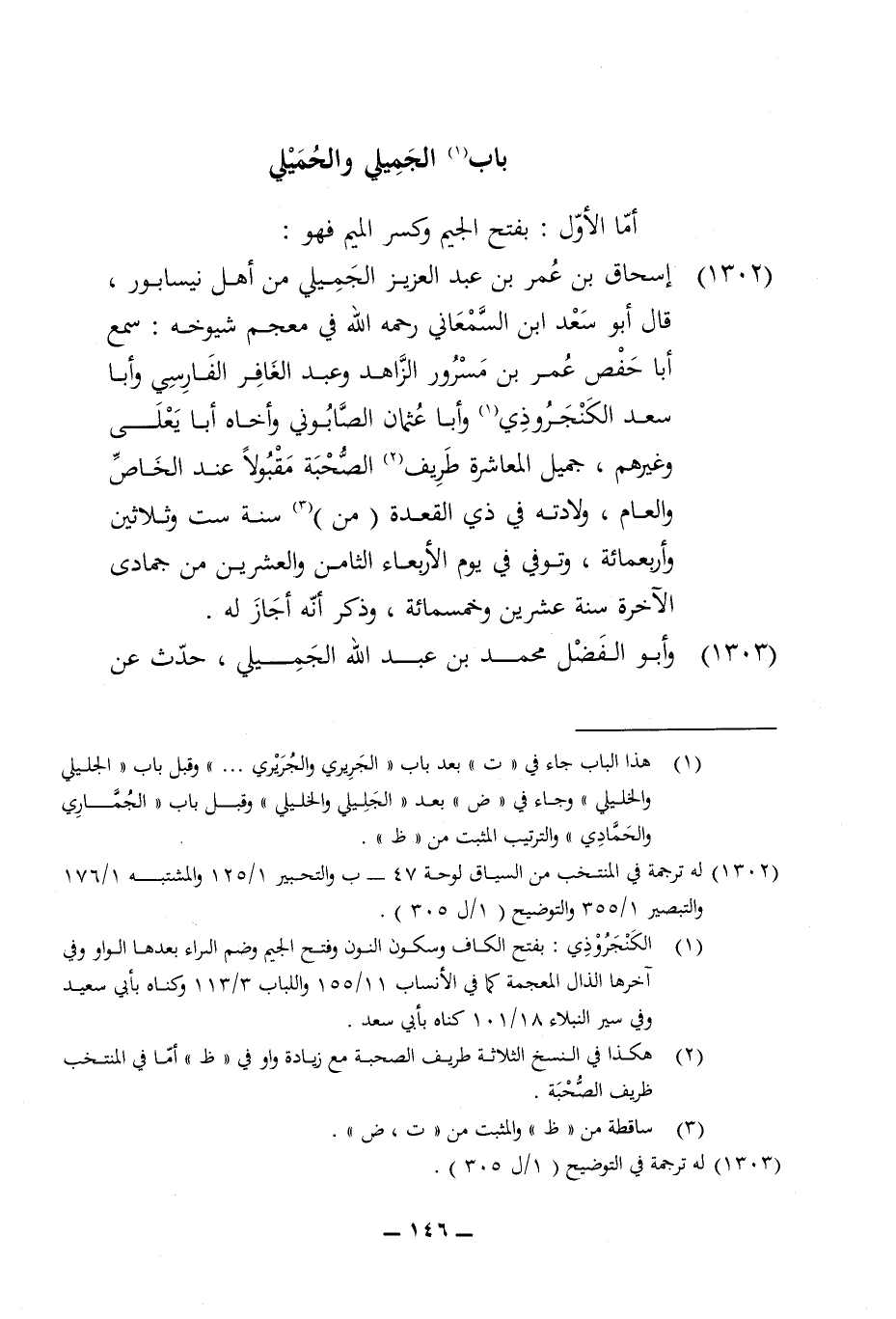 1302 - إِسْحَاق بن عمر بن عبد الْعَزِيز الجميلي من أهل نيسابور قَالَ أَبُو سعد ابْن السَّمْعَانِيّ رَحمَه الله فِي مُعْجم شُيُوخه سمع أَبَا حَفْص عمر بن مسرور الزَّاهِد وَعبد الغافر الْفَارِسِي وَأَبا سعد الكنجروذي وابا عُثْمَان الصَّابُونِي وأخاه أَبَا يعلى وَغَيرهم جميل المعاشرة طريف الصُّحْبَة مَقْبُولًا عِنْد الْخَاص وَالْعَام وِلَادَته فِي ذِي الْقعدَة من سنة سِتّ وَثَلَاثِينَ وَأَرْبَعمِائَة وَتُوفِّي فِي يَوْم الْأَرْبَعَاء الثَّامِن وَالْعِشْرين من جُمَادَى الْآخِرَة سنة عشْرين وَخَمْسمِائة وَذكر أَنه أجَاز لَهُ