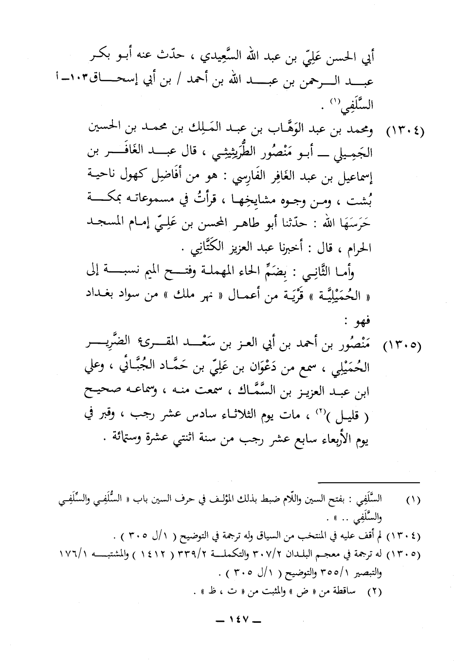 1304 - وَمُحَمّد بن عبد الْوَهَّاب بن عبد الْملك بن مُحَمَّد بن الْحُسَيْن الجميلي أَبُو مَنْصُور الطريثيثي قَالَ عبد الغافر بن إِسْمَاعِيل بن عبد الغافر الْفَارِسِي هُوَ من أفاضل كهول نَاحيَة بِشَتٍّ وَمن وُجُوه مشايخها قَرَأت فِي مسموعاته بِمَكَّة حرسها الله حَدثنَا أَبُو طَاهِر المحسن بن عَليّ إِمَام الْمَسْجِد الْحَرَام قَالَ أخبرنَا عبد الْعَزِيز الكتاني