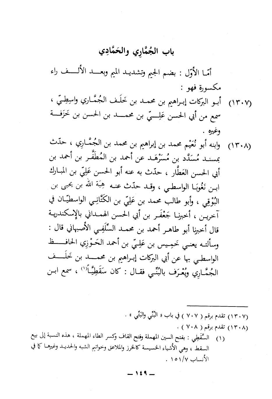 1308 - وَابْنه أَبُو نعيم مُحَمَّد بن إِبْرَاهِيم بن مُحَمَّد بن الجماري حدث بِمُسْنَد مُسَدّد بن مسرهد عَن أَحْمد بن المطفر بن أَحْمد بن أبي الْحسن الْعَطَّار حدث بِهِ عَنهُ أَبُو الْحسن عَليّ بن الْمُبَارك ابْن نغويا الوَاسِطِيّ وَقد حدث عَنهُ هبة الله بن يحيى بن البوقي وَأَبُو طَالب مُحَمَّد بن عَليّ بن الكتاني الواسطيان فِي آخَرين أخبرنَا جَعْفَر بن أبي الْحسن الْهَمدَانِي بالإسكندرية قَالَ أخبرنَا أَبُو طَاهِر أَحْمد بن مُحَمَّد السلَفِي الْأَصْبَهَانِيّ قَالَ وَسَأَلته يَعْنِي خَمِيس بن عَليّ بن أَحْمد الْحَوْزِيِّ الْحَافِظ الوَاسِطِيّ بهَا عَن أبي البركات إِبْرَاهِيم بن مُحَمَّد بن خلف الجماري وَيعرف بالبني فَقَالَ كَانَ سقطيا سمع ابْن
