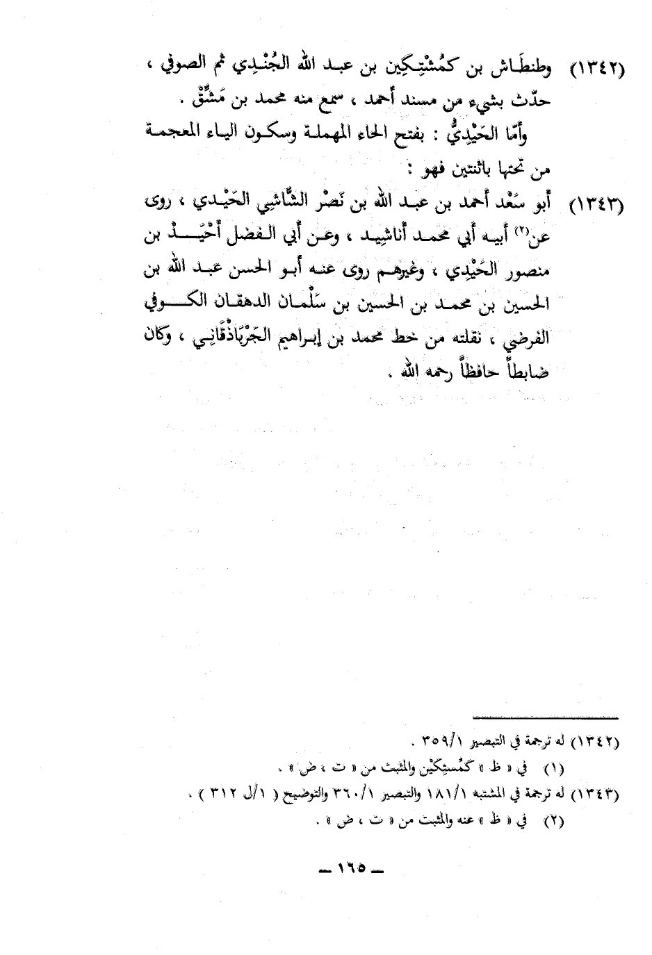 1343 - أَبُو سعد أَحْمد بن عبد الله بن نصر الشَّاشِي الحيدي روى عَن أَبِيه أبي مُحَمَّد أناشيد وَعَن أبي الْفضل أحيد بن مَنْصُور الحيدي وَغَيرهم روى عَنهُ أَبُو الْحسن عبد الله بن الْحُسَيْن بن مُحَمَّد بن الْحُسَيْن بن سلمَان الدهْقَان الْكُوفِي الفرضي نقلته من خطّ مُحَمَّد بن إِبْرَاهِيم الجرباذقاني وَكَانَ ضابطا حَافِظًا رَحمَه الله