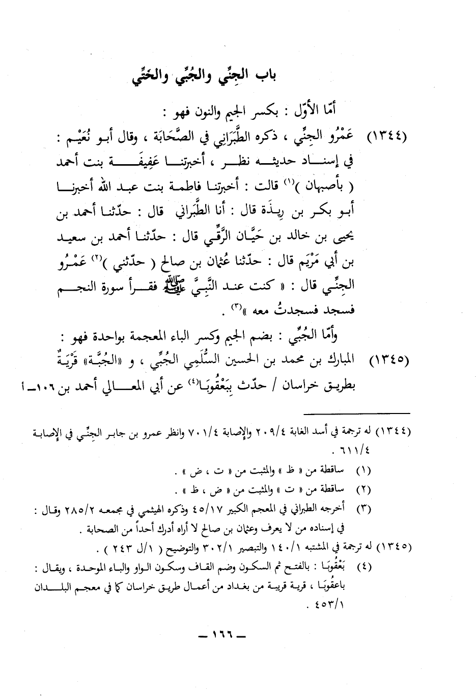 1344 - عَمْرو الجني ذكره الطَّبَرَانِيّ فِي الصَّحَابَة وَقَالَ أَبُو نعيم فِي إِسْنَاد حَدِيثه نظر أخبرتنا عفيفة بنت أَحْمد بأصبهان قَالَت أخبرتنا فَاطِمَة بنت عبد الله أخبرنَا أَبُو بكر بن ريذة قَالَ أَنا الطَّبَرَانِيّ قَالَ حَدثنَا أَحْمد بن يحيى بن خَالِد بن حَيَّان الرقي قَالَ حَدثنَا أَحْمد بن سعيد بن أبي مَرْيَم قَالَ حَدثنَا عُثْمَان بن صَالح حَدثنِي عَمْرو الجني قَالَ كنت عِنْد النَّبِي صلى الله عَلَيْهِ وَسلم فَقَرَأَ سُورَة النَّجْم فَسجدَ فسجدت مَعَه