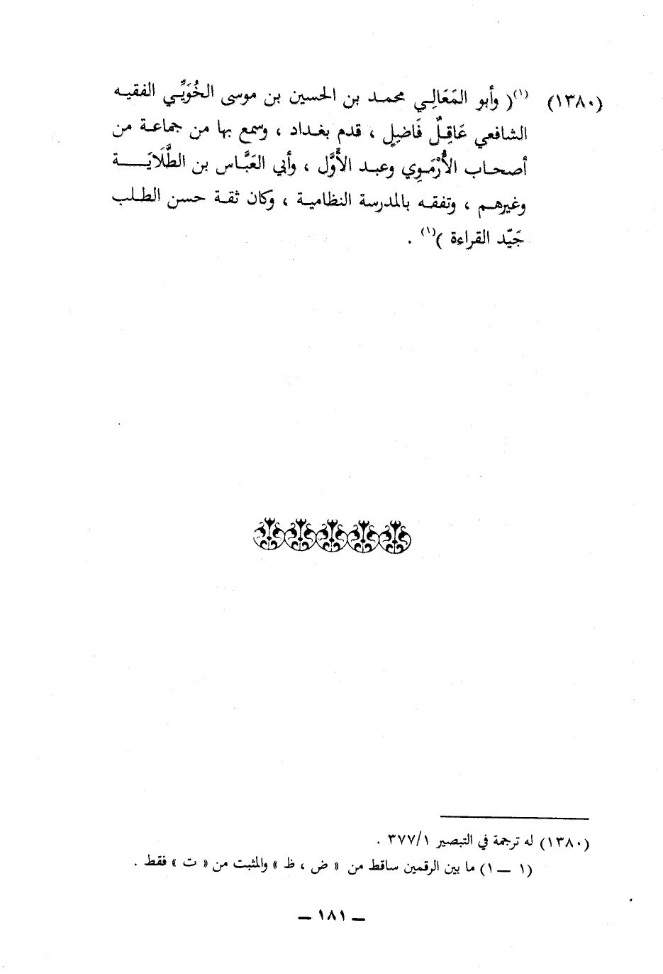 1380 - وَأَبُو الْمَعَالِي مُحَمَّد بن الْحُسَيْن بن مُوسَى الخويي الْفَقِيه الشَّافِعِي عَاقل فَاضل قدم بَغْدَاد وَسمع بهَا من جمَاعَة من أَصْحَاب الأرموي وَعبد الأول وَأبي الْعَبَّاس بن الطلاية وَغَيرهم وتفقه بِالْمَدْرَسَةِ النظامية وَكَانَ ثِقَة حسن الطّلب جيد الْقِرَاءَة