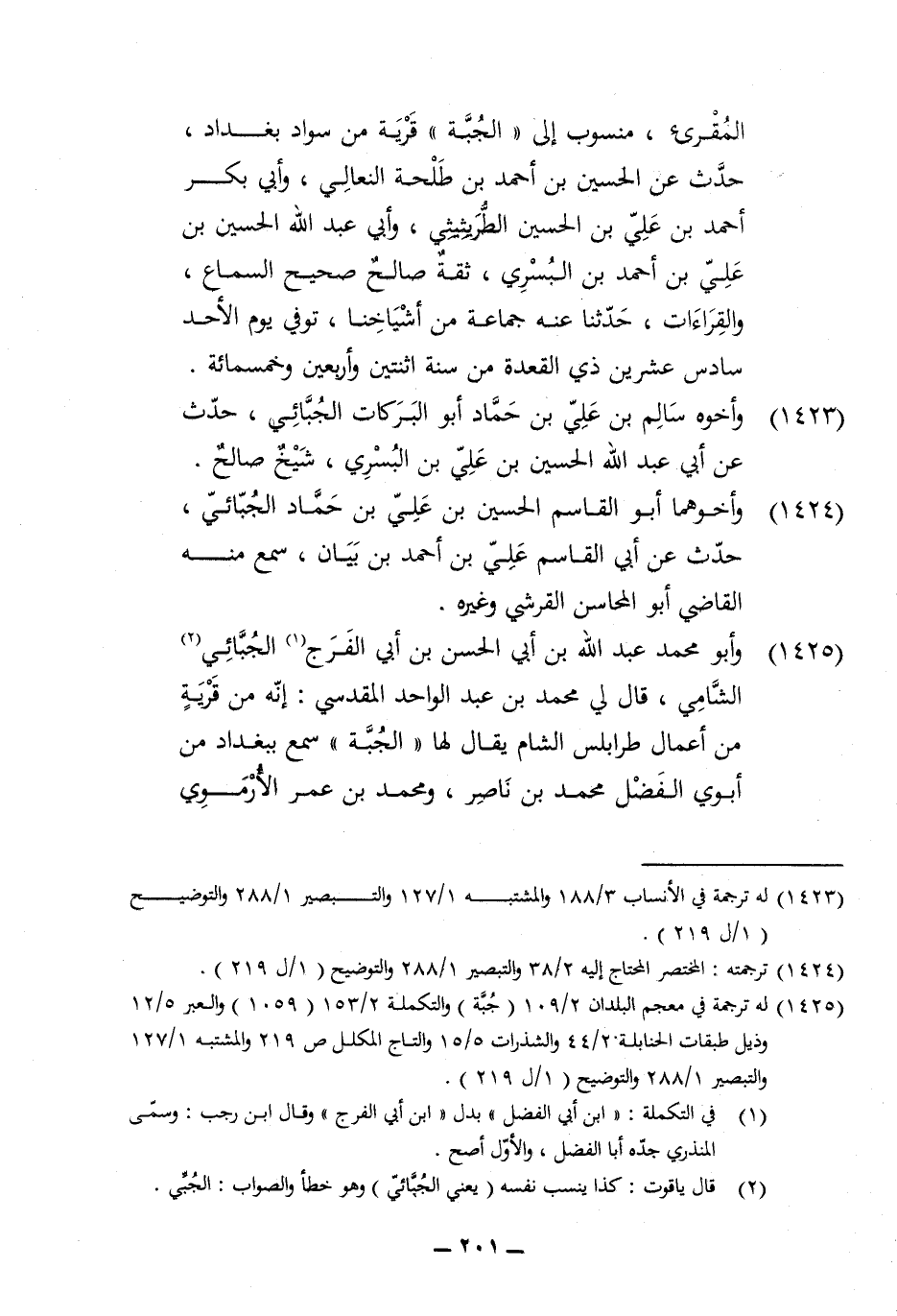 1425 - وَأَبُو مُحَمَّد عبد الله بن أبي الْحسن بن ابي الْفرج الجبائي الشَّامي قَالَ لي مُحَمَّد بن عبد الْوَاحِد الْمَقْدِسِي إِنَّه من قَرْيَة من أَعمال طرابلس الشَّام يُقَال لَهَا الْجُبَّة سمع بِبَغْدَاد من أَبَوي الْفضل مُحَمَّد بن نَاصِر وَمُحَمّد بن عمر الأرموي