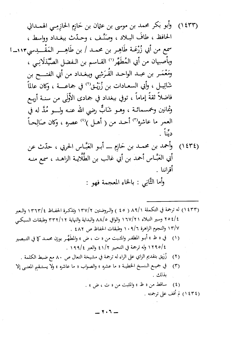 1433 - وَأَبُو بكر مُحَمَّد بن مُوسَى بن عُثْمَان بن حَازِم الْحَازِمِي الْهَمدَانِي الْحَافِظ طَاف الْبِلَاد وصنف وَحدث بِبَغْدَاد وواسط سمع من أبي زرْعَة طَاهِر بن مُحَمَّد بن طَاهِر الْمَقْدِسِي وبأصبهان من أبي المطهر الْقَاسِم بن الْفضل الصيدلاني وَمعمر بن عبد الْوَاحِد الْقرشِي وببغداد من أبي الْفَتْح بن شاتيل وابي السعادات بن زُرَيْق فِي جمَاعَة وَكَانَ عَالما فَاضلا ثِقَة إِمَامًا توفّي بِبَغْدَاد فِي جُمَادَى الأولى من سنة ارْبَعْ وَثَمَانِينَ وَخَمْسمِائة وَهُوَ شَاب رضى الله عَنهُ وَلَو مد لَهُ فِي الْعُمر مَا عاشره أحد من أهل عصره وَكَانَ صَالحا دينا