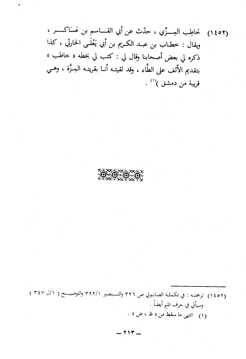 1452 - خَاطب الْمزي حدث عَن أبي الْقَاسِم بن عَسَاكِر وَيُقَال خطاب بن عبد الْكَرِيم بن أبي يعلى الْحَارِثِيّ كَذَا ذكره لي بعض أَصْحَابنَا وَقَالَ لي كتب لي بِخَطِّهِ خَاطب بِتَقْدِيم الْألف على الطَّاء وَقد لَقيته أَنا بقريته المزة وَهِي قريبَة من دمشق