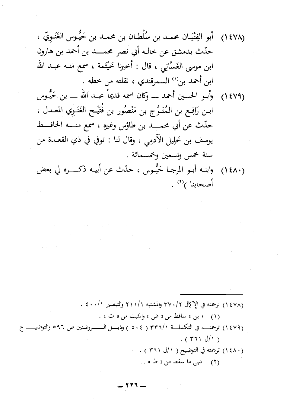 1478 - أَبُو الفتيان مُحَمَّد بن سُلْطَان بن مُحَمَّد بن حيوس الغنوي حدث بِدِمَشْق عَن خَاله أبي نصر مُحَمَّد بن احْمَد بن هَارُون ابْن مُوسَى الغساني قَالَ أخبرنَا خَيْثَمَة سمع مِنْهُ عبد الله ابْن أَحْمد بن السَّمرقَنْدِي نقلته من خطه