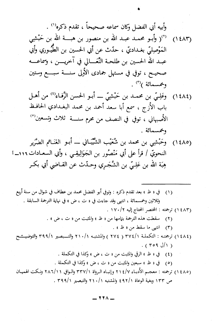 1485 - وَحبشِي بن مُحَمَّد بن شُعَيْب الشَّيْبَانِيّ أَبُو الْغَنَائِم الضَّرِير النَّحْوِيّ قَرَأَ على أبي مَنْصُور بن الجواليقي وَأبي السعادات هبة الله بن عَليّ بن الشجري وَحدث عَن القَاضِي ابي بكر مُحَمَّد ابْن عبد الْبَاقِي النصري حدث عَنهُ عَليّ بن نصر بن هَارُون توفّي بِبَغْدَاد فِي سنة خمس وَسِتِّينَ وَخَمْسمِائة