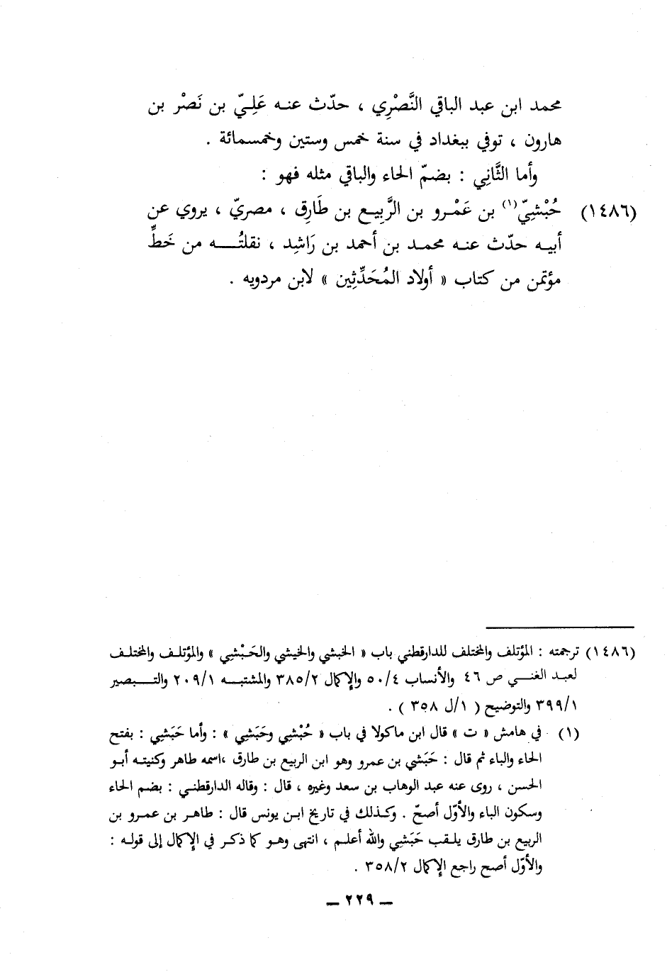 1486 - حبشِي بن عَمْرو بن الرّبيع بن طَارق مصري يرْوى عَن أَبِيه حدث عَنهُ مُحَمَّد بن أَحْمد بن رَاشد نقلته من خطّ مؤتمن من كتاب اولاد الْمُحدثين لِابْنِ مرْدَوَيْه
