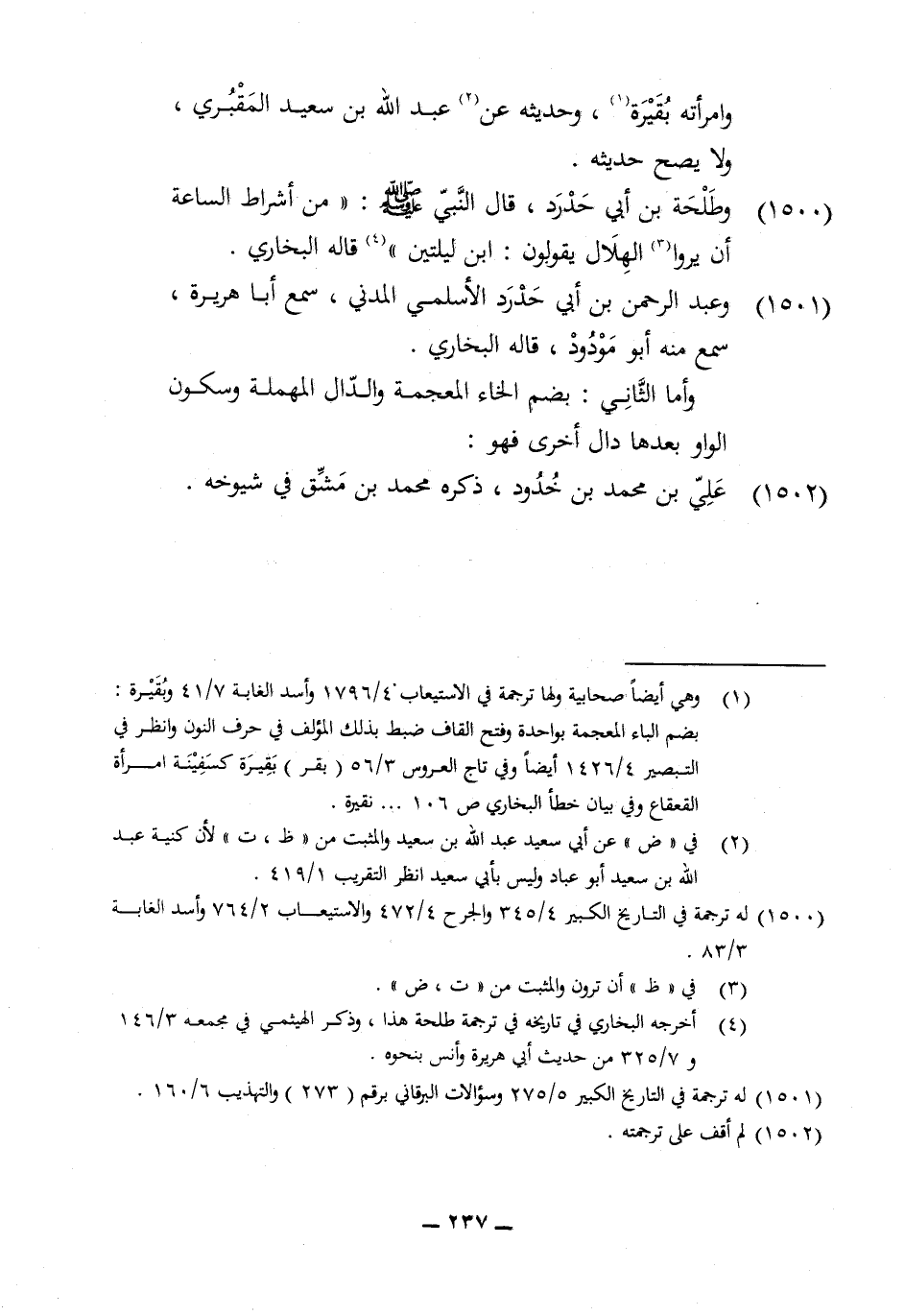 1500 - وَطَلْحَة بن أبي حَدْرَد قَالَ النَّبِي صلى الله عَلَيْهِ وَسلم من أَشْرَاط السَّاعَة أَن يرَوا الْهلَال يَقُولُونَ ابْن لَيْلَتَيْنِ قَالَه البُخَارِيّ
