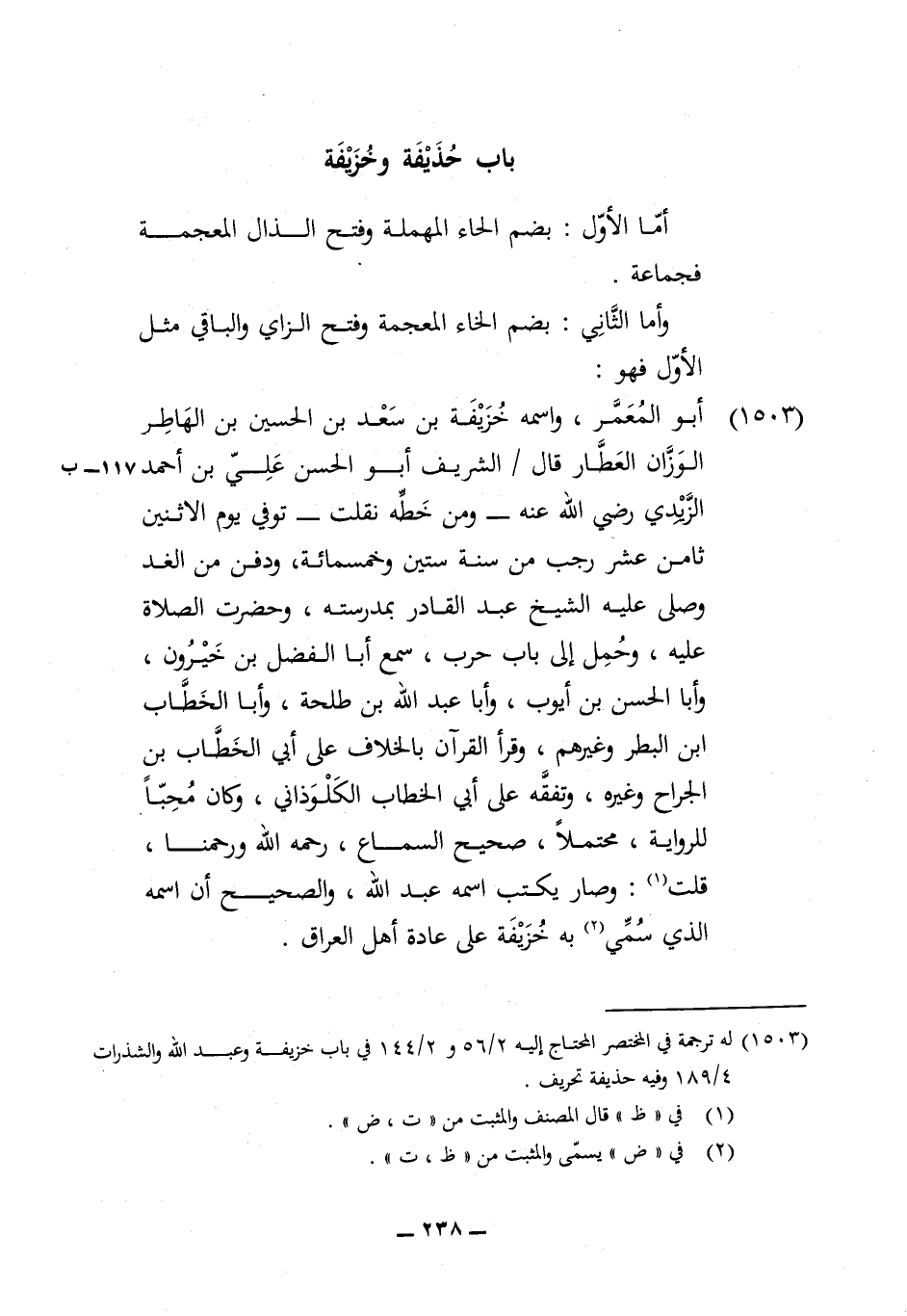 1503 - أَبُو المعمر واسْمه خزيفة بن سعد بن الْحُسَيْن بن الهاطر الْوزان الْعَطَّار قَالَ الشريف ابو الْحسن عَليّ بن أَحْمد الزيدي رَضِي الله عَنهُ وَمن خطه نقلت توفّي يَوْم الأثنين ثامن عشر رَجَب من سنة سِتِّينَ وَخَمْسمِائة وَدفن من الْغَد وَصلى عَلَيْهِ الشَّيْخ عبد الْقَادِر بمدرسته وَحَضَرت الصَّلَاة عَلَيْهِ وَحمل إِلَى بَاب حَرْب سمع أَبَا الْفضل بن خيرون وابا الْحسن بن أَيُّوب وَأَبا عبد الله بن طَلْحَة وَأَبا الْخطاب ابْن البطر وَغَيرهم وَقَرَأَ الْقُرْآن بِالْخِلَافِ على أبي الْخطاب بن الْجراح وَغَيره وتفقه على أبي الْخطاب الكلوذاني وَكَانَ محبا للرواية مُحْتملا صَحِيح السماع رَحمَه الله ورحمنا قلت وَصَارَ يكْتب اسْمه عبد الله وَالصَّحِيح أَن اسْمه الَّذِي سمي بِهِ خزيفة على عَادَة اهل الْعرَاق