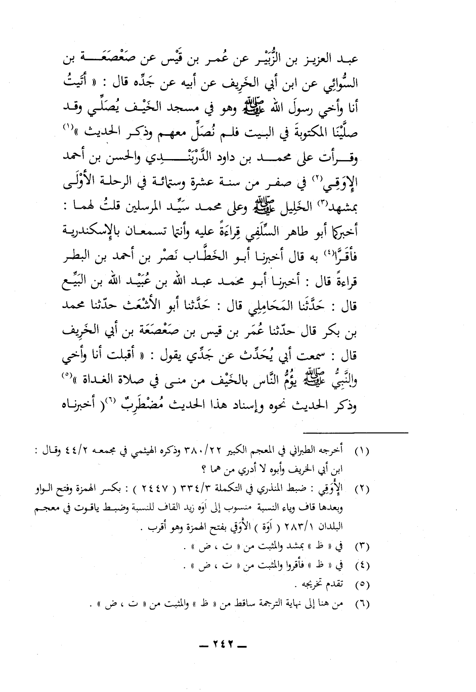 عبد الْعَزِيز بن الزبير عَن عمر بن قيس عَن صعصعة بن السوَائِي عَن ابْن أبي الخريف عَن أَبِيه عَن جده قَالَ أتيت أَنا وَأخي رَسُول الله صلى الله عَلَيْهِ وَسلم وَهُوَ فِي مَسْجِد الْخيف يُصَلِّي وَقد صلينَا الْمَكْتُوبَة فِي الْبَيْت فَلم نصل مَعَهم وَذكر الحَدِيث وقرأت على مُحَمَّد بن دَاوُد الدربندي وَالْحسن بن أَحْمد الإوقي فِي صفر من سنة عشرَة وسِتمِائَة فِي الرحلة الأولى بمشهد الْخَلِيل صلى الله عَلَيْهِ وَسلم وعَلى مُحَمَّد سيد الْمُرْسلين قلت لَهما أخبركما أَبُو طَاهِر السلَفِي قِرَاءَة عَلَيْهِ وأنتما تسمعان بالإسكندرية فأقرأ بِهِ قَالَ أخبرنَا أَبُو الْخطاب نصر بن أَحْمد بن البطر قِرَاءَة قَالَ أخبرنَا ابو مُحَمَّد عبد الله بن عبيد الله بن البيع قَالَ حدنثا الْمحَامِلِي قَالَ حَدثنَا أَبُو الْأَشْعَث حَدثنَا مُحَمَّد بن بكر قَالَ حَدثنَا عمر بن قيس بن صعصعة بن أبي الخريف قَالَ سَمِعت أبي يحدث عَن جدي يَقُول أَقبلت أَنا وَأخي وَالنَّبِيّ صلى الله عَلَيْهِ وَسلم يؤم النَّاس بالخيف من منى فِي صَلَاة الْغَدَاة وَذكر الحَدِيث نَحوه وَإسْنَاد هَذَا الحَدِيث مُضْطَرب أخبرناه