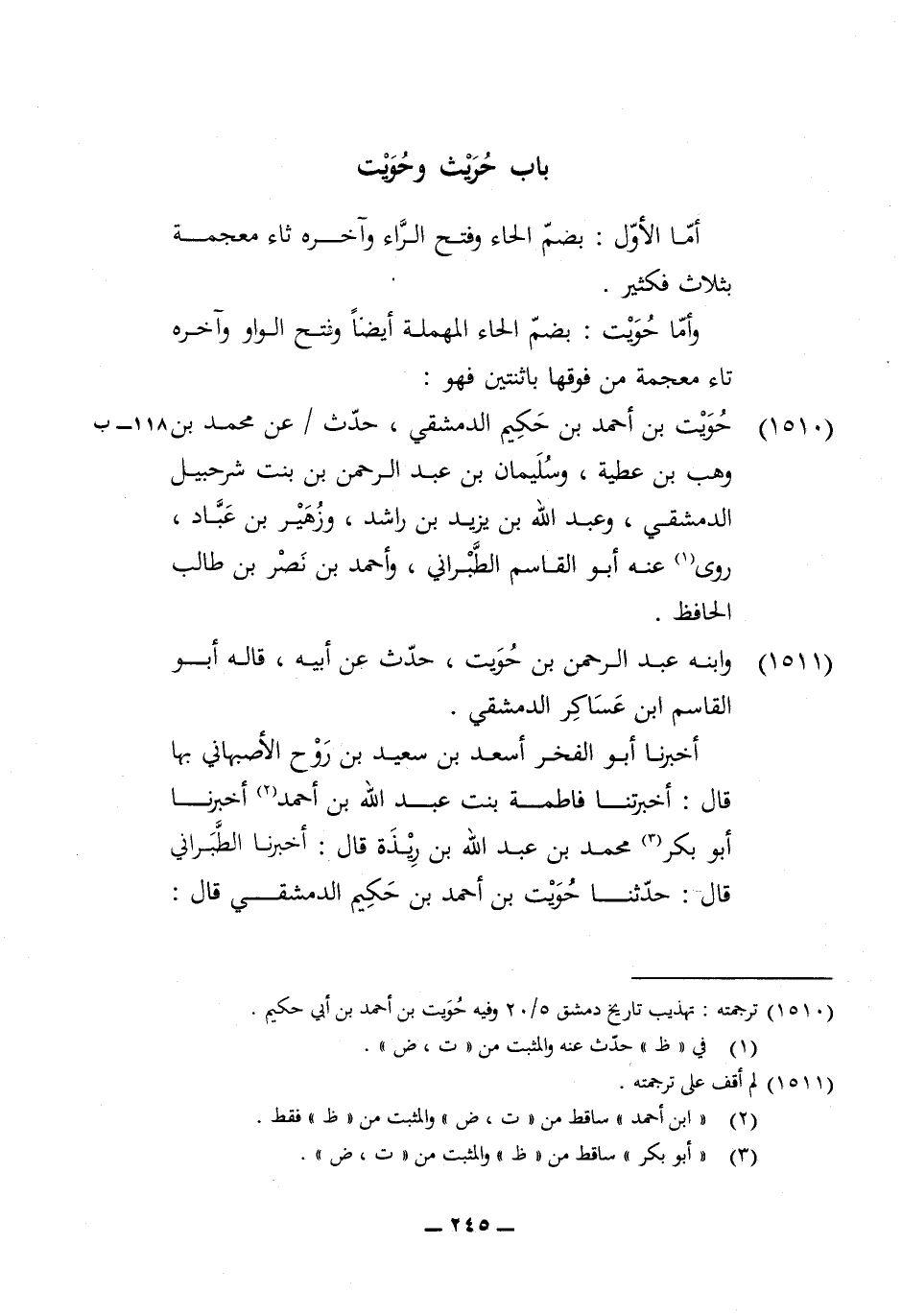 1510 - حويت بن أَحْمد بن حَكِيم الدِّمَشْقِي حدث عَن مُحَمَّد بن وهب بن عَطِيَّة وَسليمَان بن عبد الرَّحْمَن بن بنت شُرَحْبِيل الدِّمَشْقِي وَعبد الله بن يزِيد بن رَاشد وَزُهَيْر بن عباد روى عَنهُ أَبُو الْقَاسِم الطَّبَرَانِيّ وَأحمد بن نصر بن طَالب الْحَافِظ