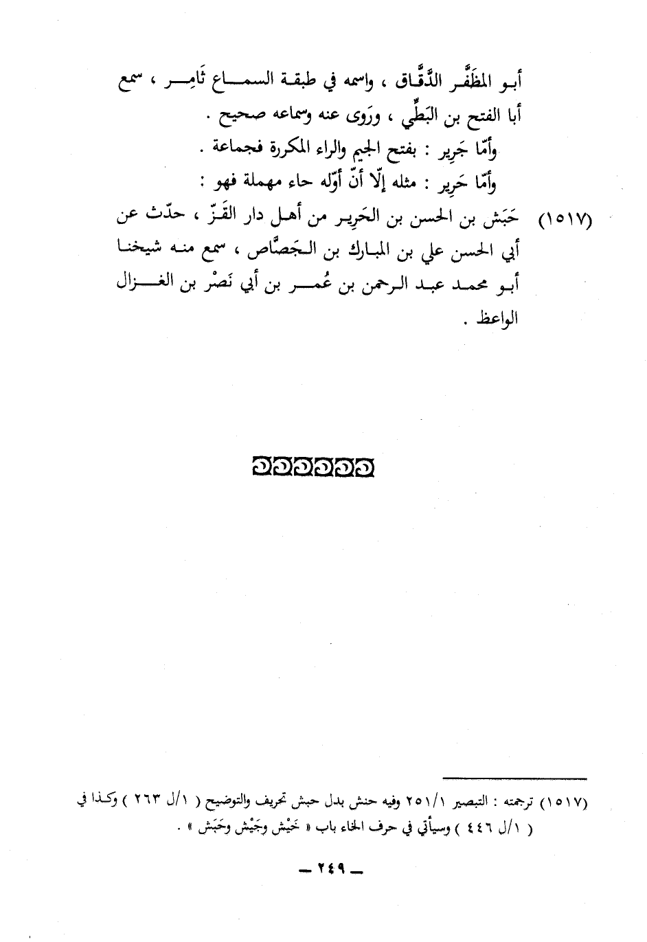 1517 - حبش بن الْحسن بن الْحَرِير من اهل دَار القز حدث عَن أبي الْحسن عَليّ بن الْمُبَارك بن الْجَصَّاص سمع مِنْهُ شَيخنَا أَبُو مُحَمَّد عبد الرَّحْمَن بن عمر بن أبي نصر بن الغزال الْوَاعِظ